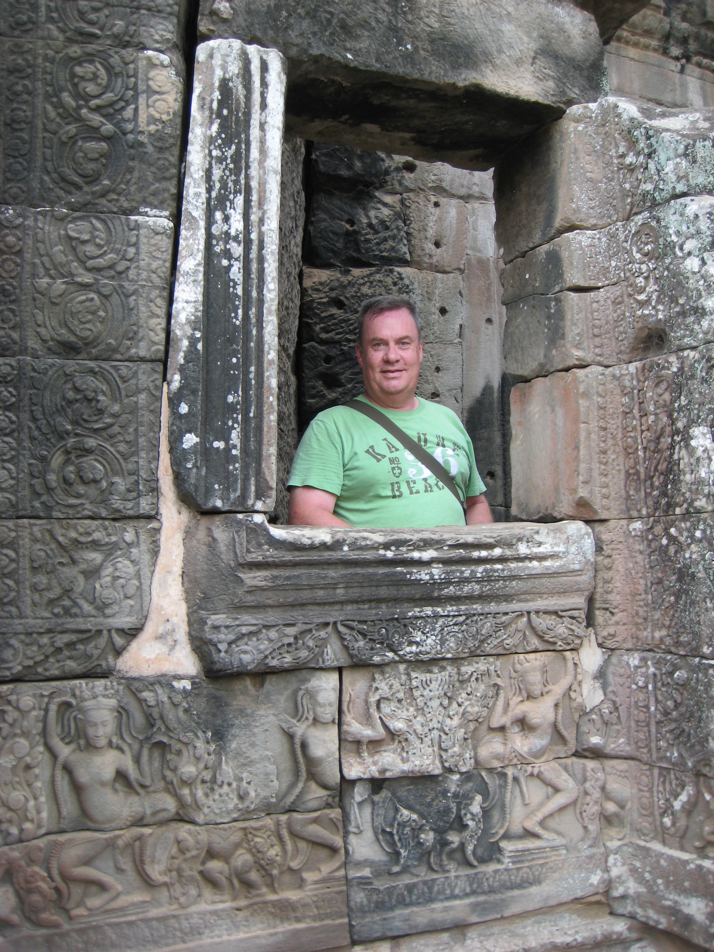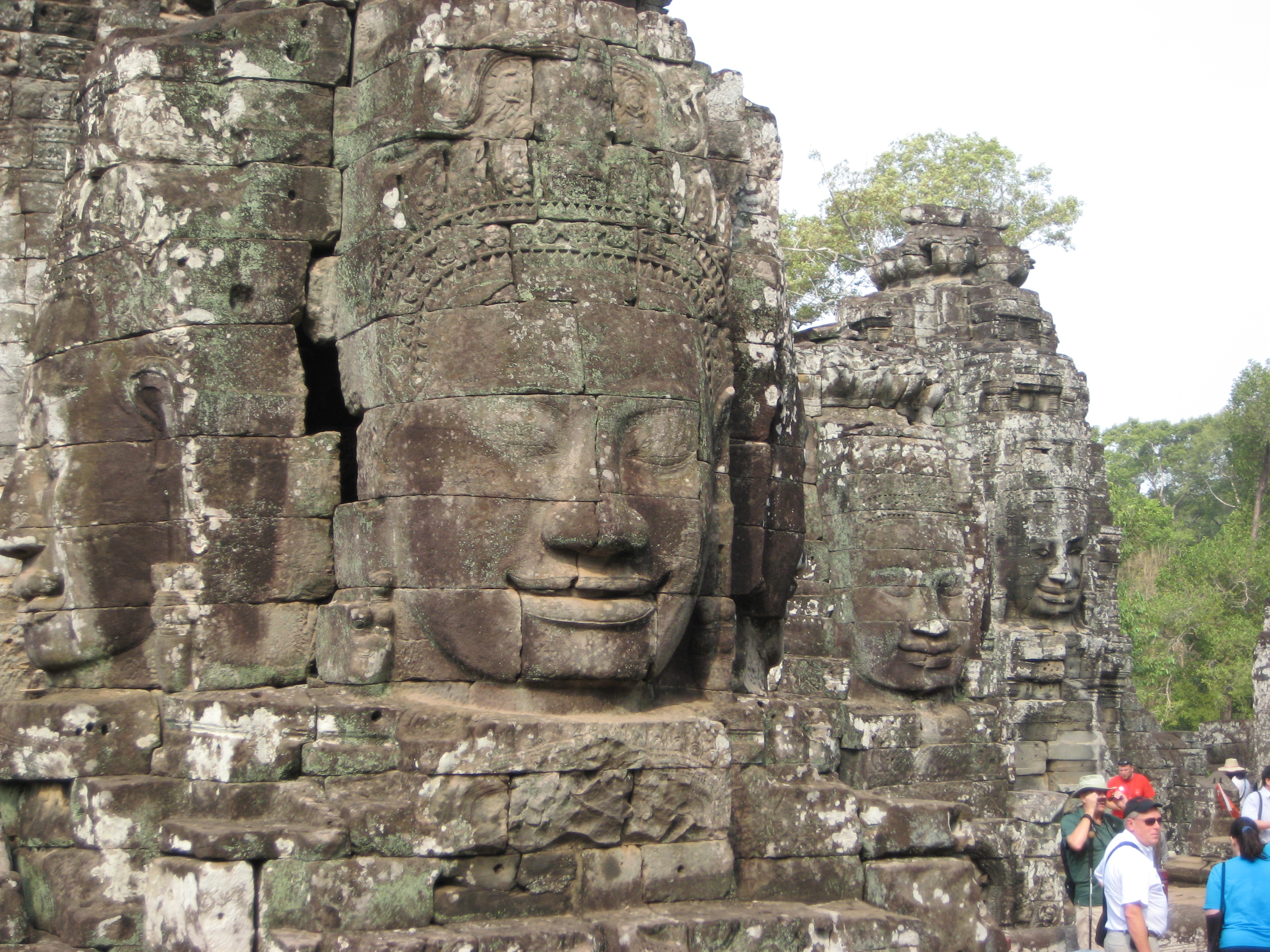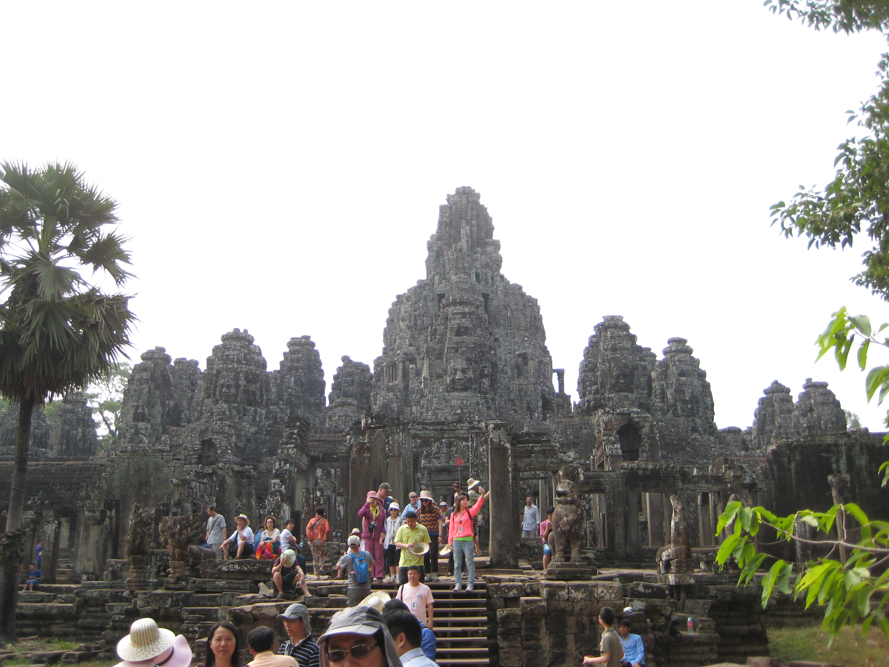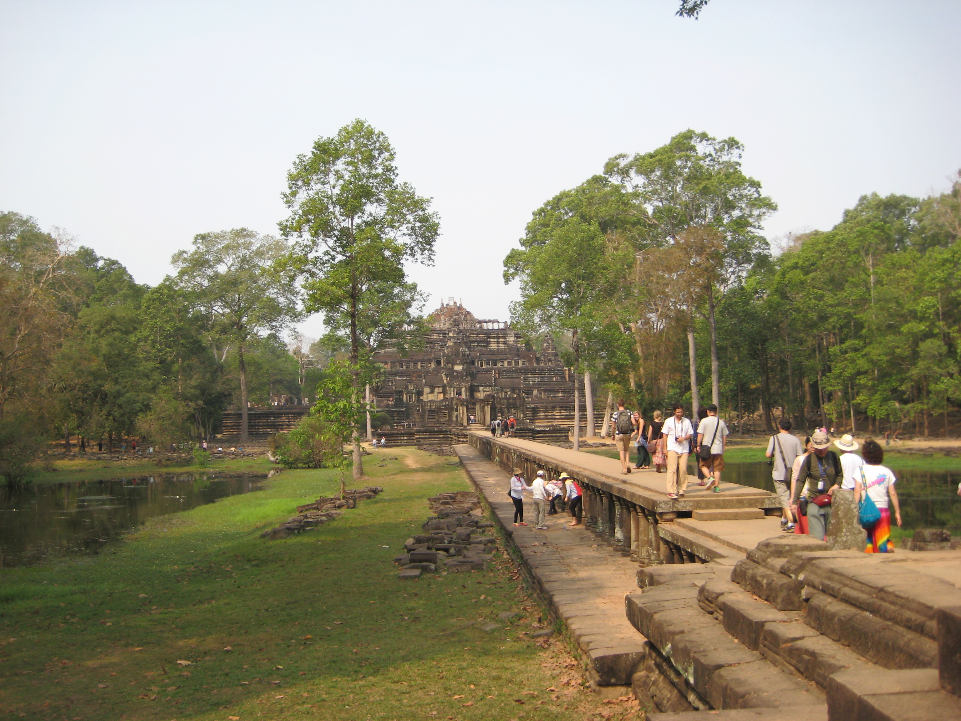 Meas, my guide decided today would be dedicated to exploring Angkor Thom (“great city”) which should in no way be confused with Angkor Wat (“great temple”). Angkor is the most important UNESCO-marked site in SE Asia and covers an area of approx 400 sq km (20 km x 20 km). At the heart of this area is Angkor Thom, a walled city of 9 sq km and in the 1100s it was the largest populated city in the world with nearly a million people. It is a perfect square (3 x 3) surrounded by a 100m wide moat and 8m high stone walls (see map). There are 4 entrances with bridges over the moat and large towers covered in 4 faces watching over all who enter. At the precise centre is the Bayon temple (Golden Tower, b. 12-13th century). Beside it is the palace ruins of Phimean Akas (Aerial Palace, b. 10-11th century). Being wooden all that remains are the bases of the buildings and the Baphoun temple. In front of the palace is the 350m-long Terrace of Elephants was used as a giant reviewing stand for public ceremonies. At one end is the Terrace of the Leper King. While many theories debate the name of this terrace, one popular one is that this is where a king with leprosy reviewed his troops from. In short, the area is huge and included all a city needed including hospitals & banks. The sheer size of everything is overwhelming and thanks to the French it was rediscovered after being claimed by the jungle in the 1800s.