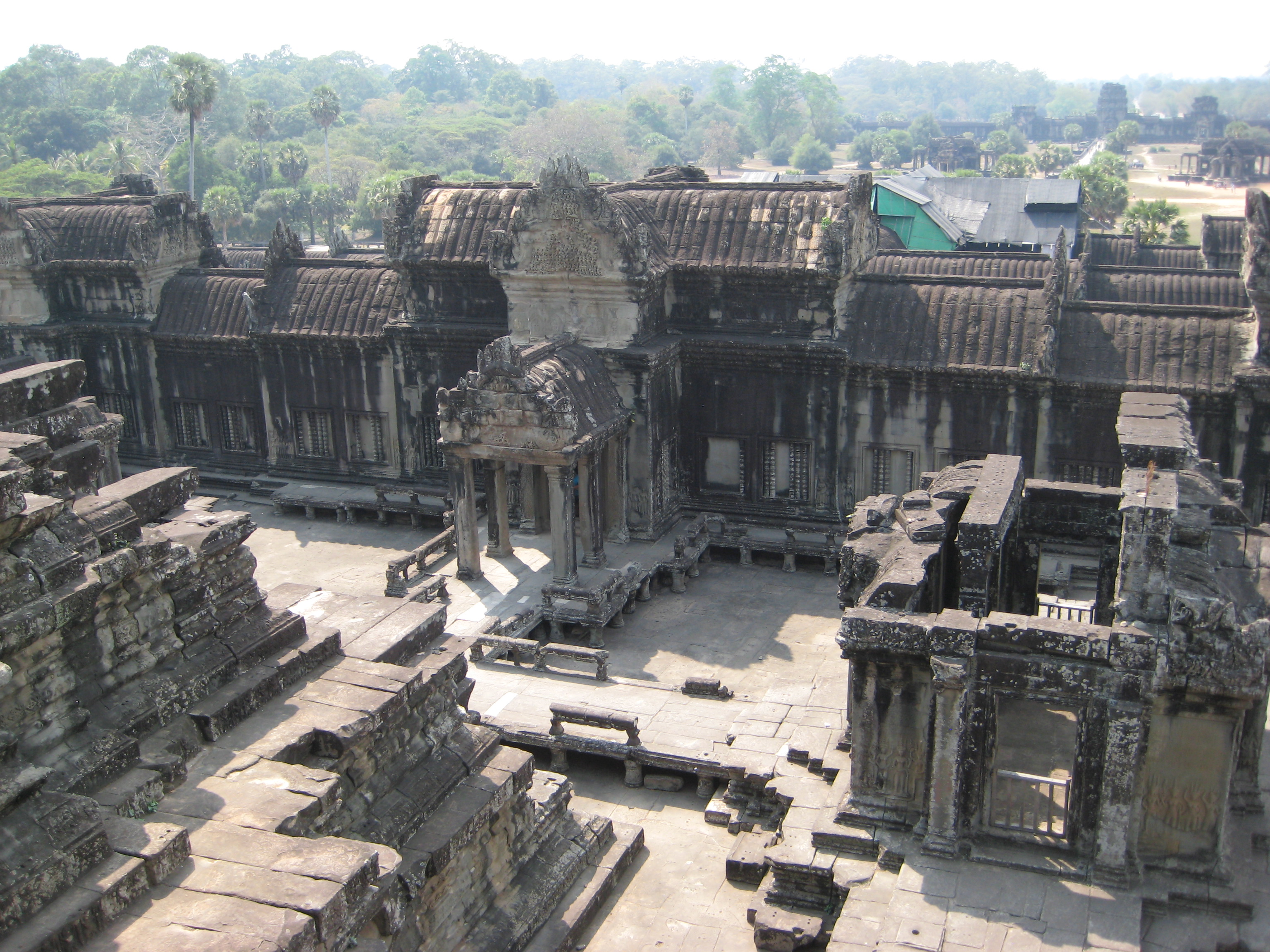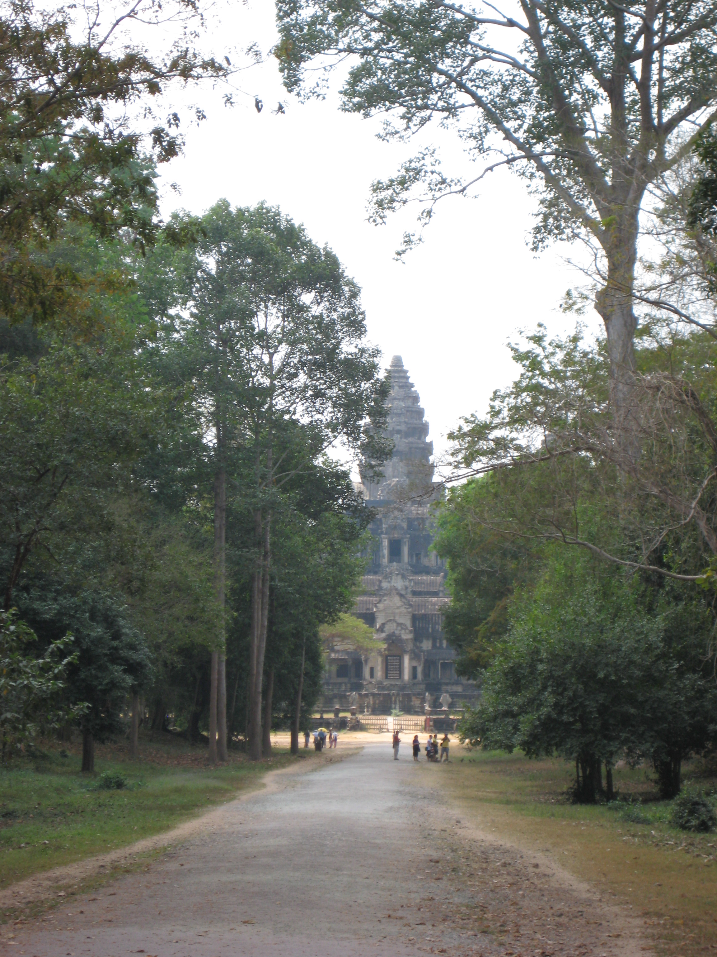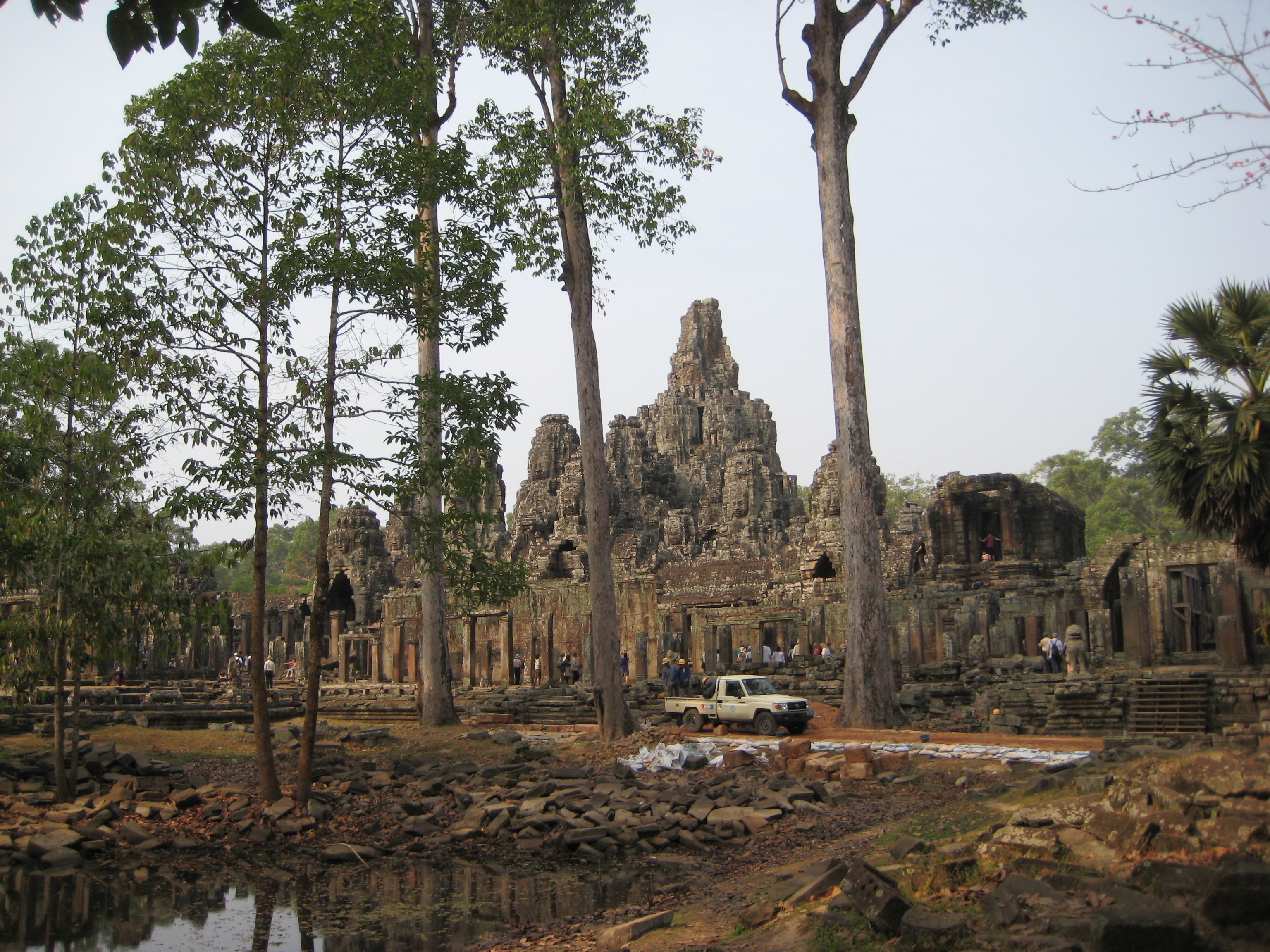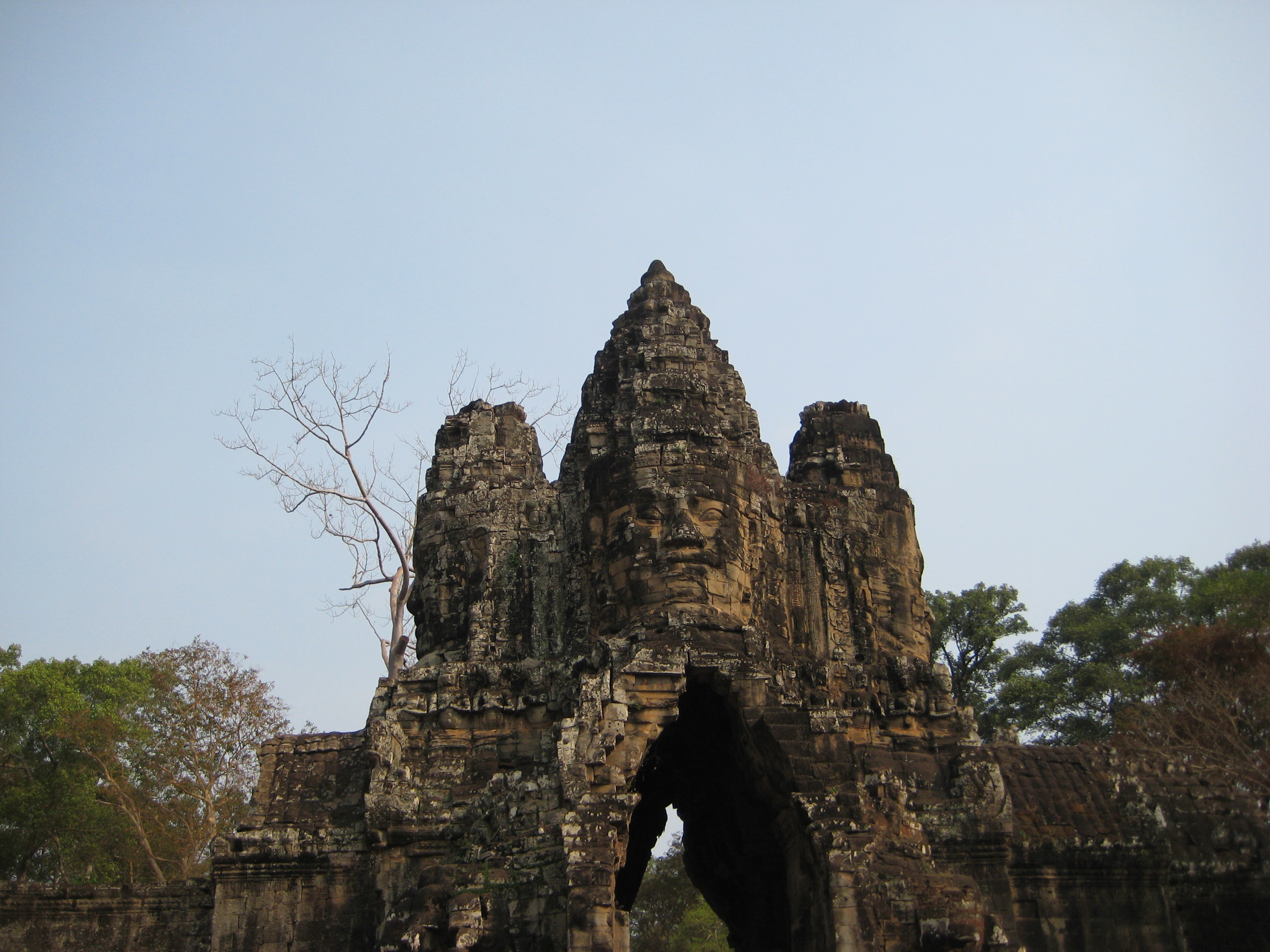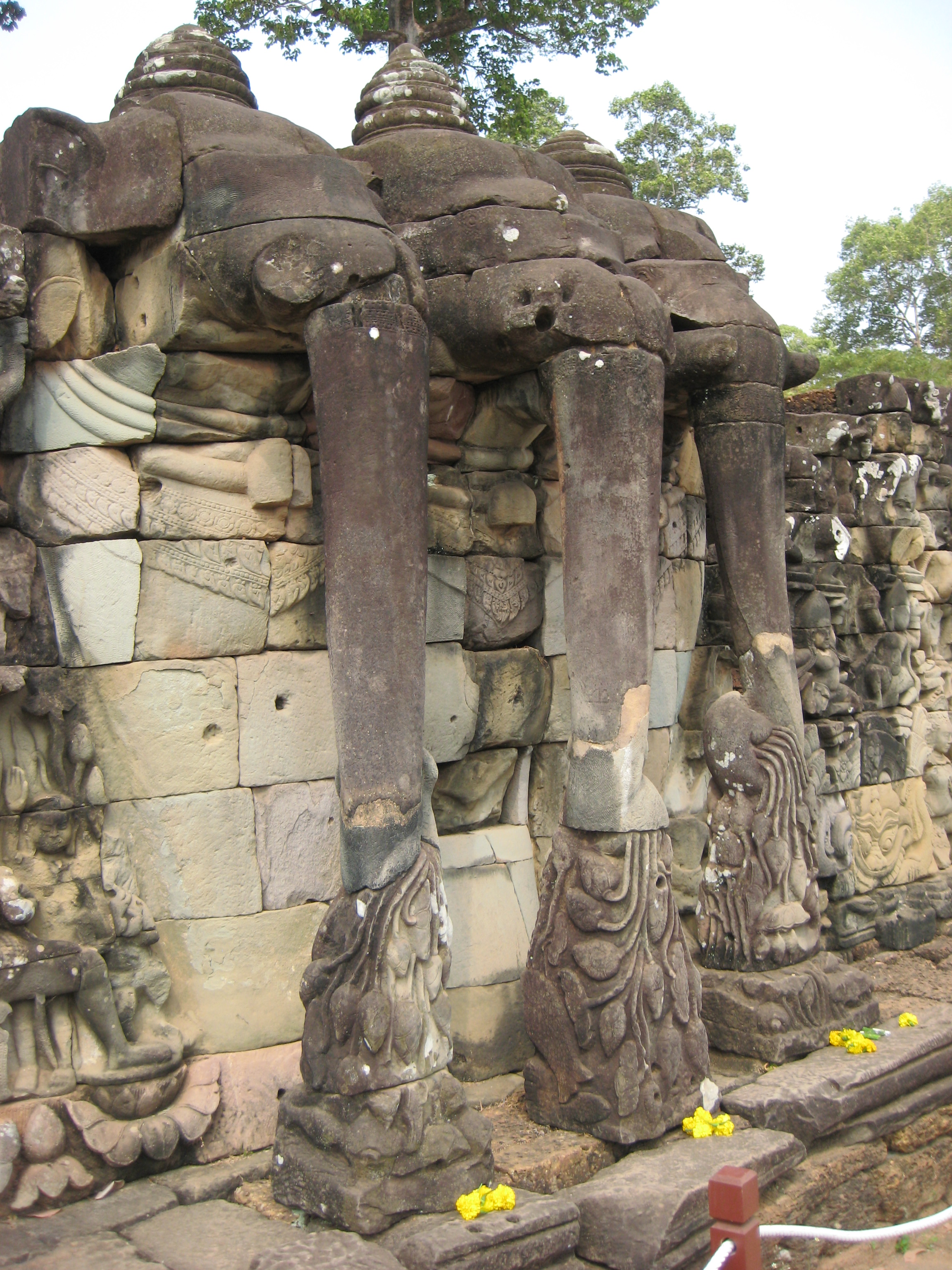 Meas, my guide decided today would be dedicated to exploring Angkor Thom (“great city”) which should in no way be confused with Angkor Wat (“great temple”). Angkor is the most important UNESCO-marked site in SE Asia and covers an area of approx 400 sq km (20 km x 20 km). At the heart of this area is Angkor Thom, a walled city of 9 sq km and in the 1100s it was the largest populated city in the world with nearly a million people. It is a perfect square (3 x 3) surrounded by a 100m wide moat and 8m high stone walls (see map). There are 4 entrances with bridges over the moat and large towers covered in 4 faces watching over all who enter. At the precise centre is the Bayon temple (Golden Tower, b. 12-13th century). Beside it is the palace ruins of Phimean Akas (Aerial Palace, b. 10-11th century). Being wooden all that remains are the bases of the buildings and the Baphoun temple. In front of the palace is the 350m-long Terrace of Elephants was used as a giant reviewing stand for public ceremonies. At one end is the Terrace of the Leper King. While many theories debate the name of this terrace, one popular one is that this is where a king with leprosy reviewed his troops from. In short, the area is huge and included all a city needed including hospitals & banks. The sheer size of everything is overwhelming and thanks to the French it was rediscovered after being claimed by the jungle in the 1800s.