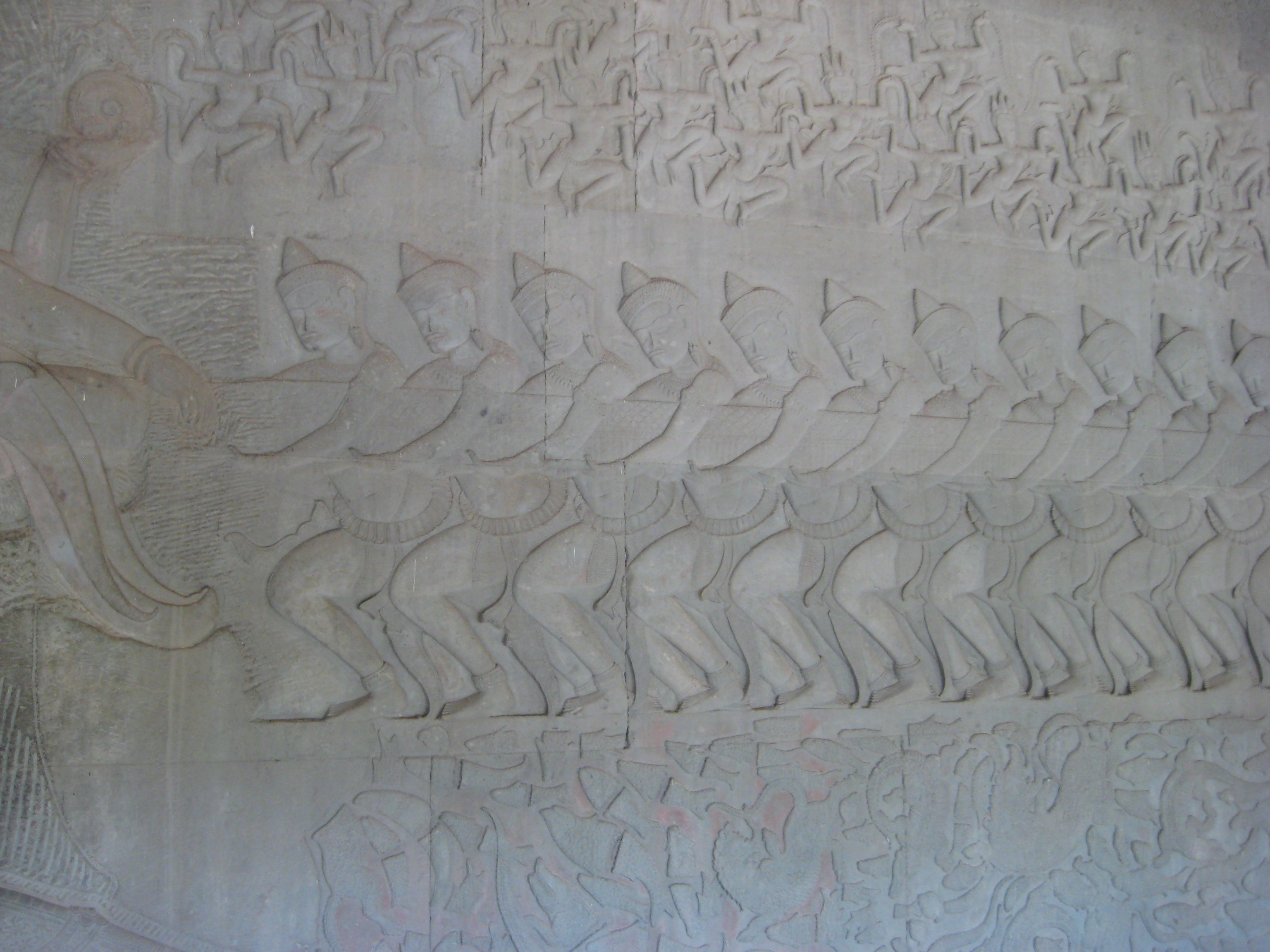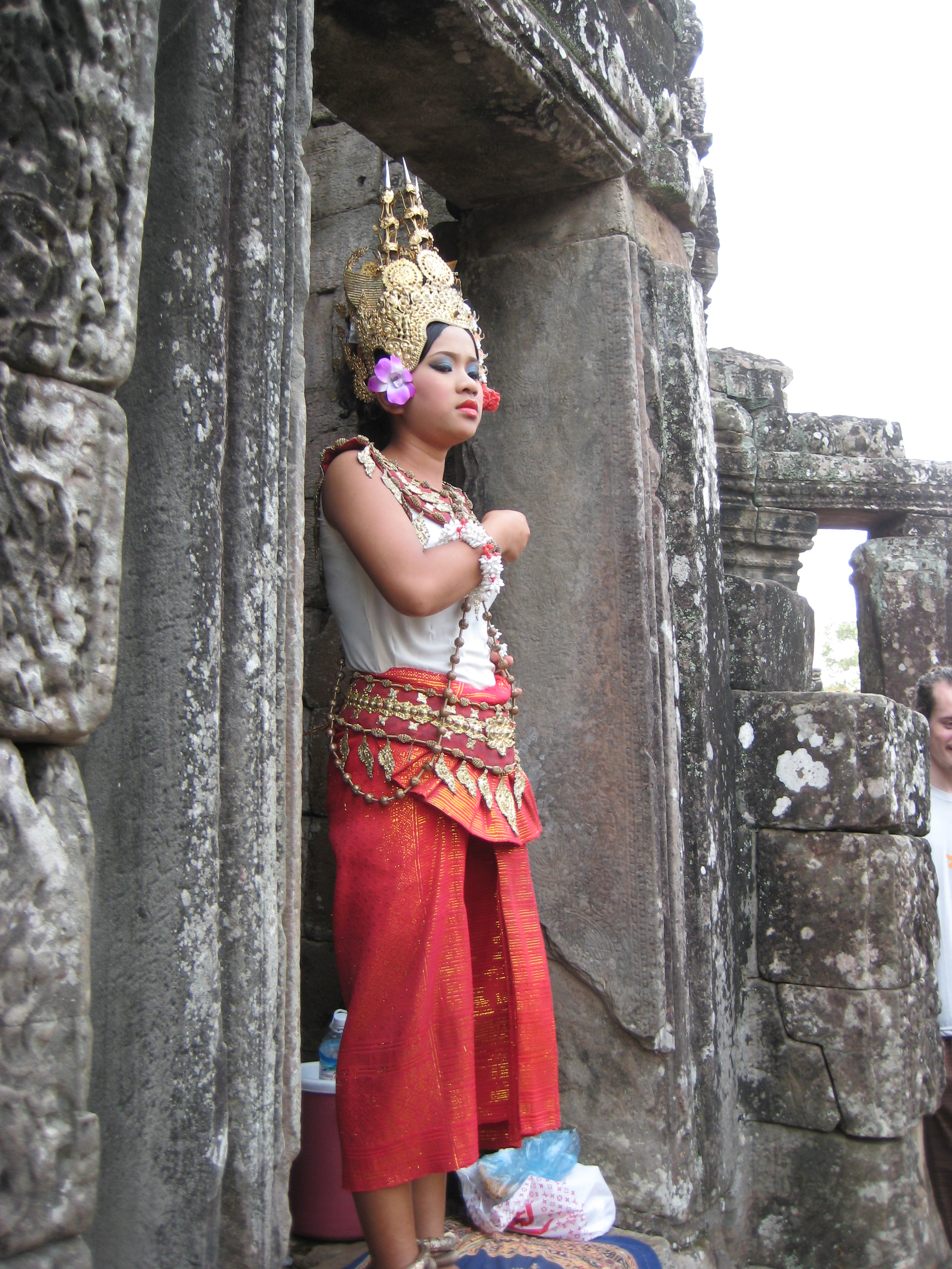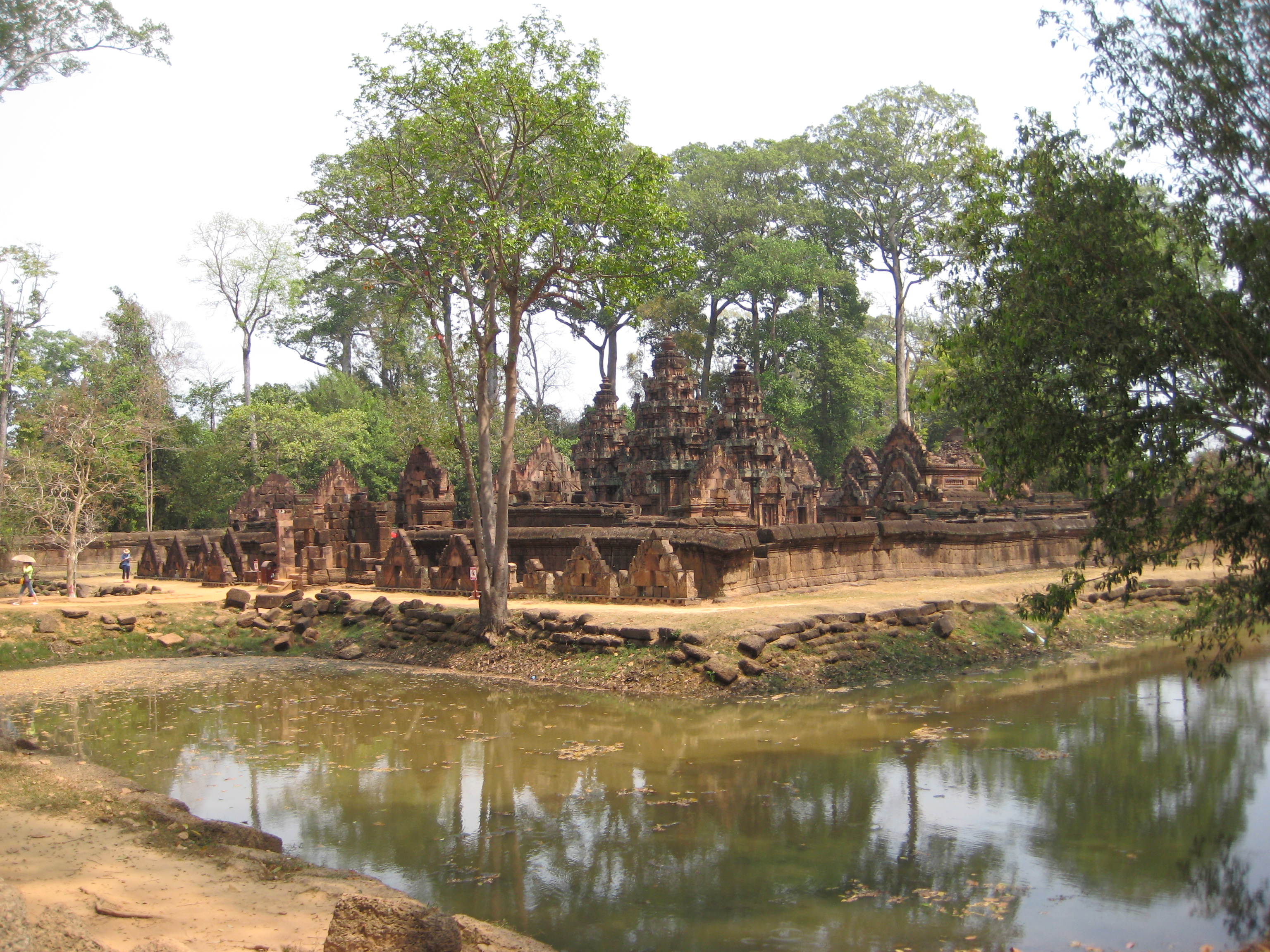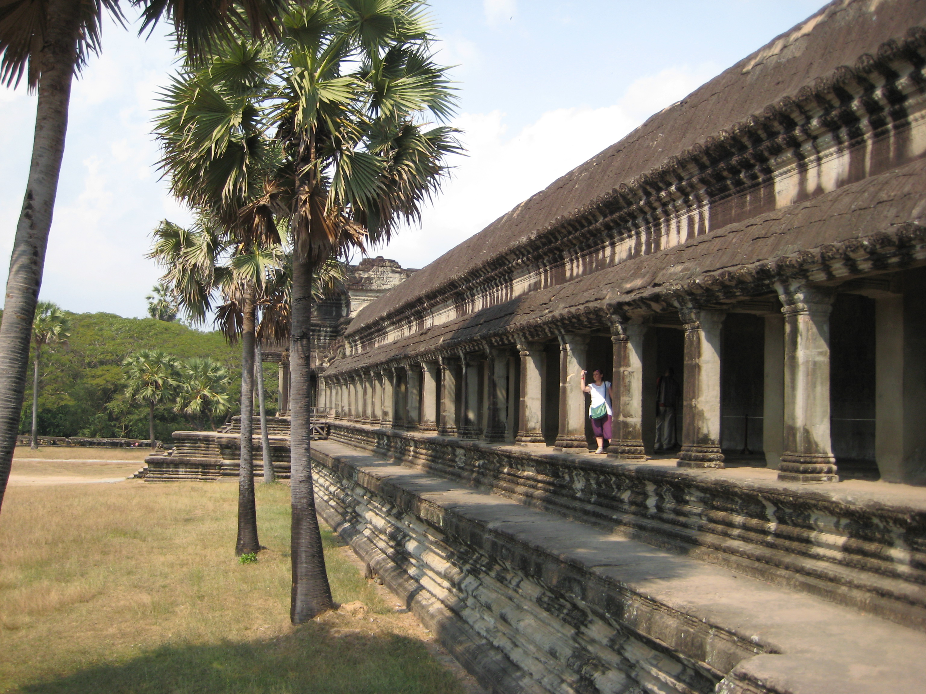 Meas, my guide decided today would be dedicated to exploring Angkor Thom (“great city”) which should in no way be confused with Angkor Wat (“great temple”). Angkor is the most important UNESCO-marked site in SE Asia and covers an area of approx 400 sq km (20 km x 20 km). At the heart of this area is Angkor Thom, a walled city of 9 sq km and in the 1100s it was the largest populated city in the world with nearly a million people. It is a perfect square (3 x 3) surrounded by a 100m wide moat and 8m high stone walls (see map). There are 4 entrances with bridges over the moat and large towers covered in 4 faces watching over all who enter. At the precise centre is the Bayon temple (Golden Tower, b. 12-13th century). Beside it is the palace ruins of Phimean Akas (Aerial Palace, b. 10-11th century). Being wooden all that remains are the bases of the buildings and the Baphoun temple. In front of the palace is the 350m-long Terrace of Elephants was used as a giant reviewing stand for public ceremonies. At one end is the Terrace of the Leper King. While many theories debate the name of this terrace, one popular one is that this is where a king with leprosy reviewed his troops from. In short, the area is huge and included all a city needed including hospitals & banks. The sheer size of everything is overwhelming and thanks to the French it was rediscovered after being claimed by the jungle in the 1800s.