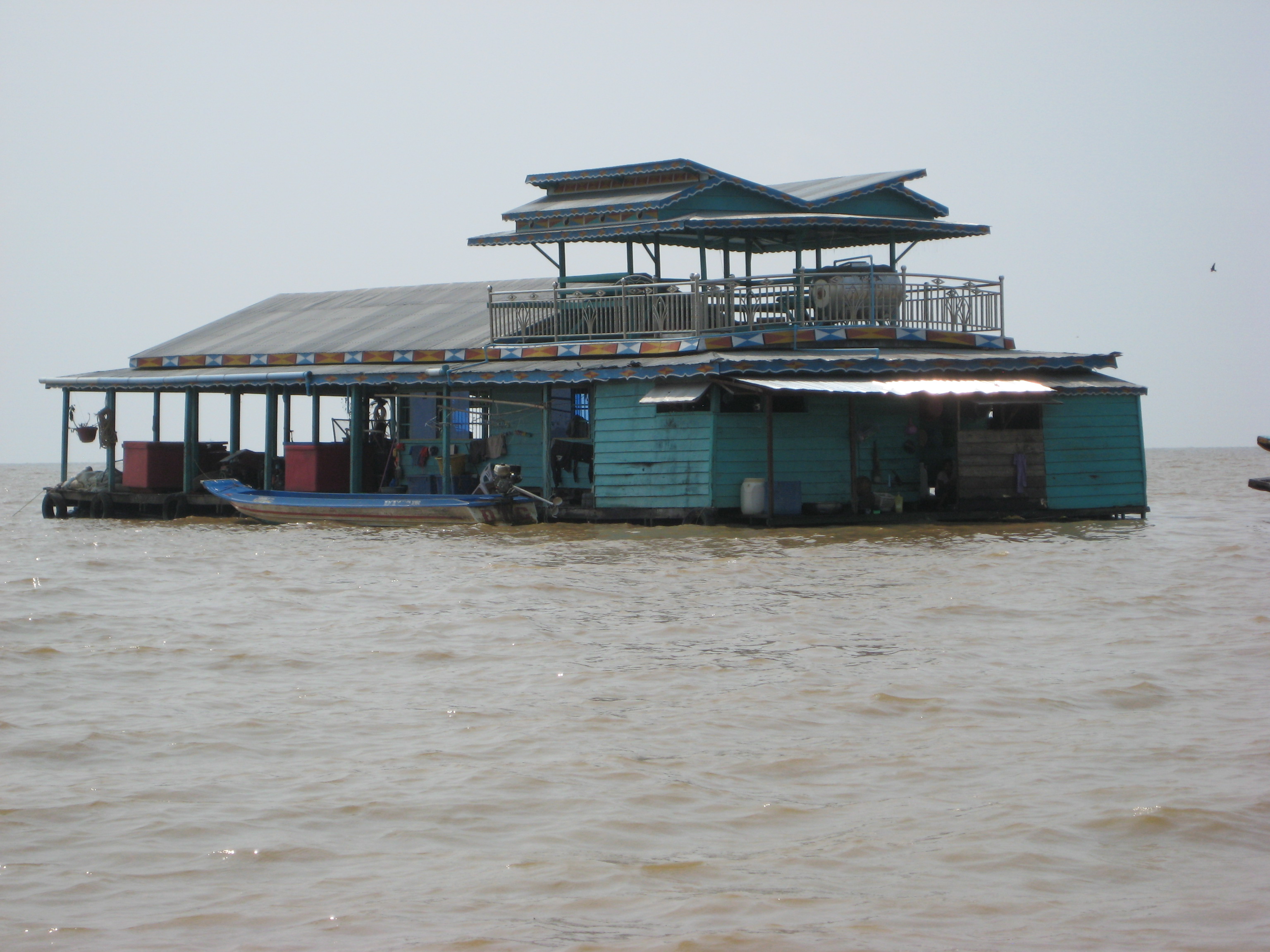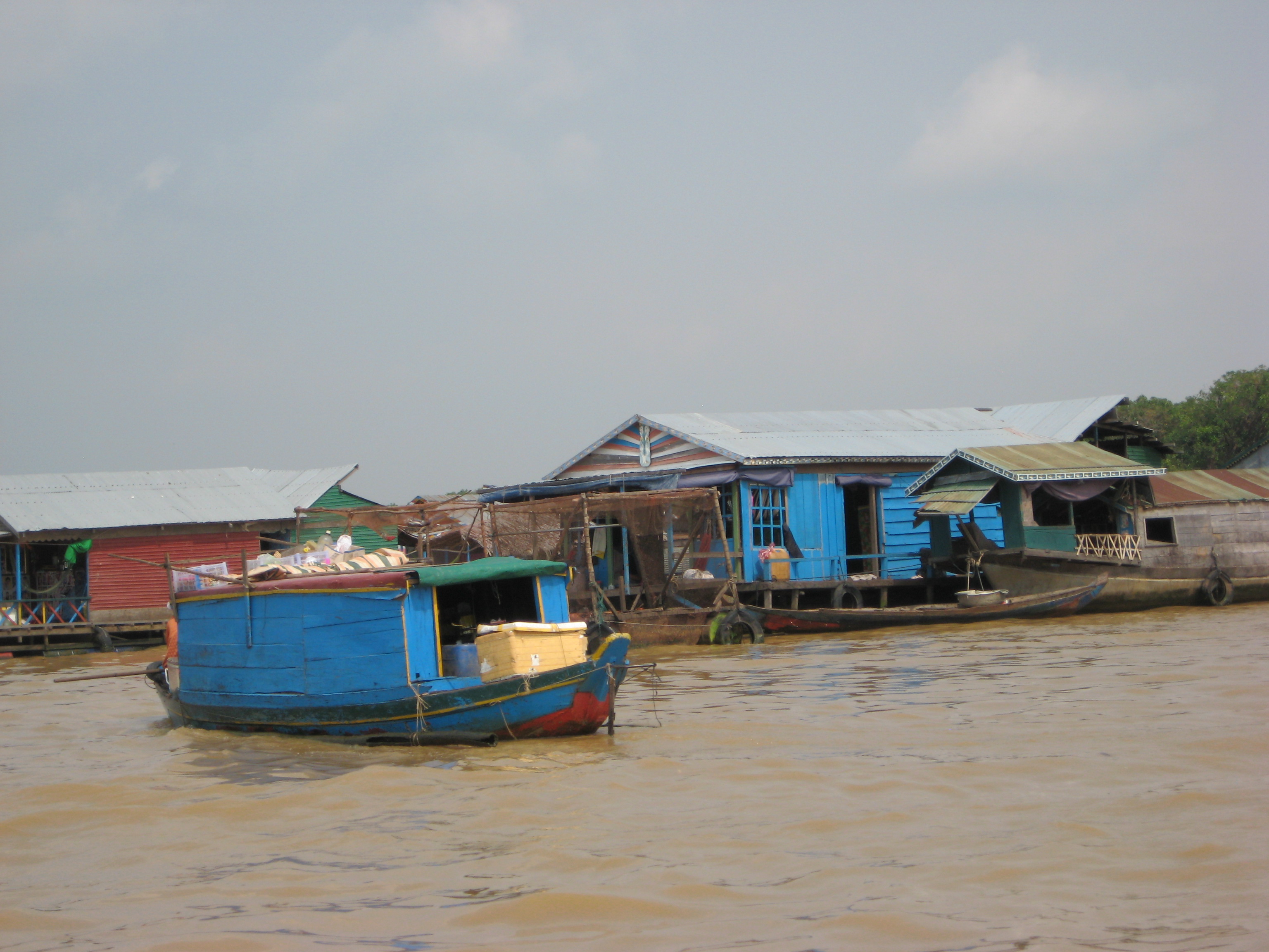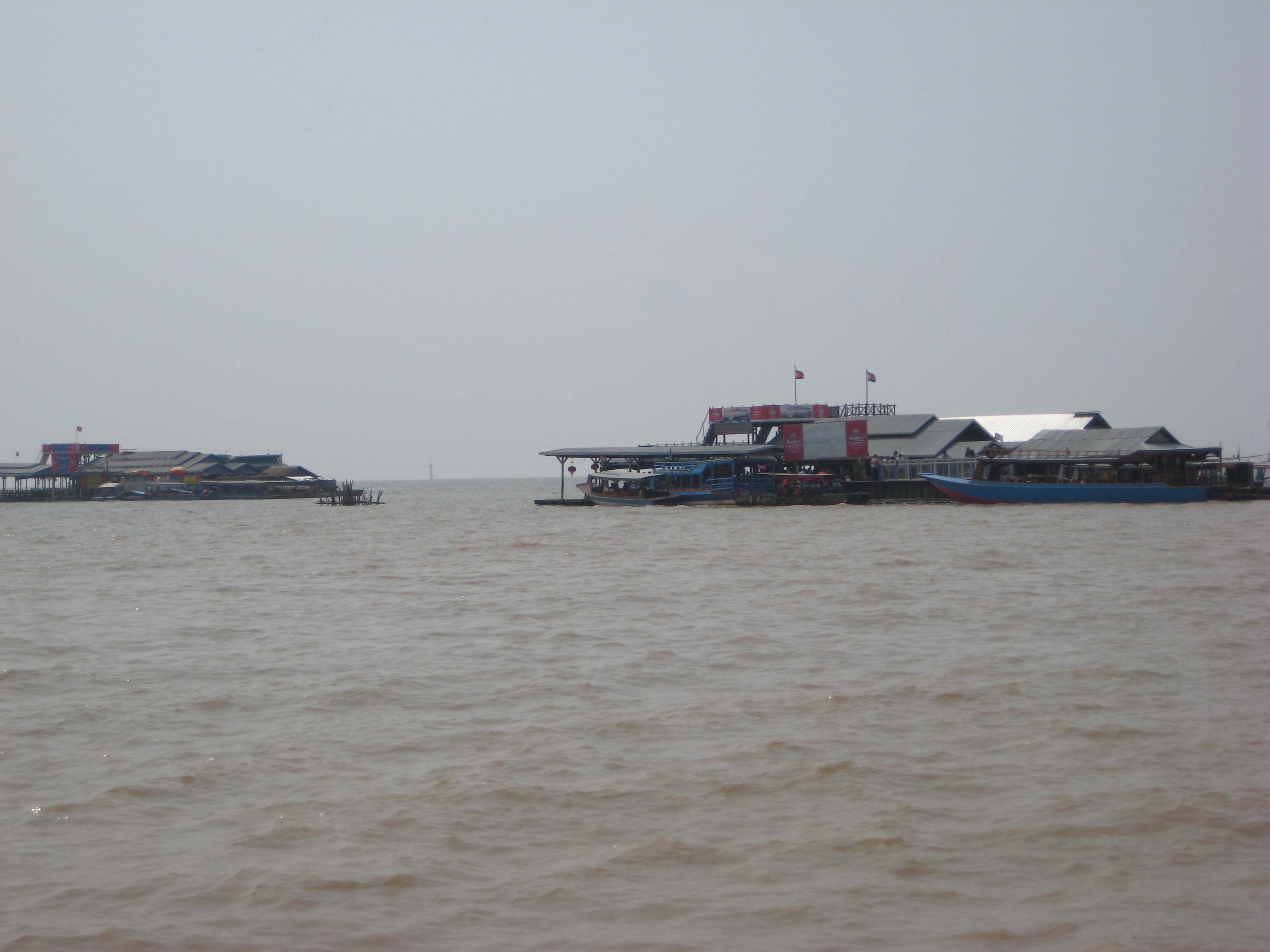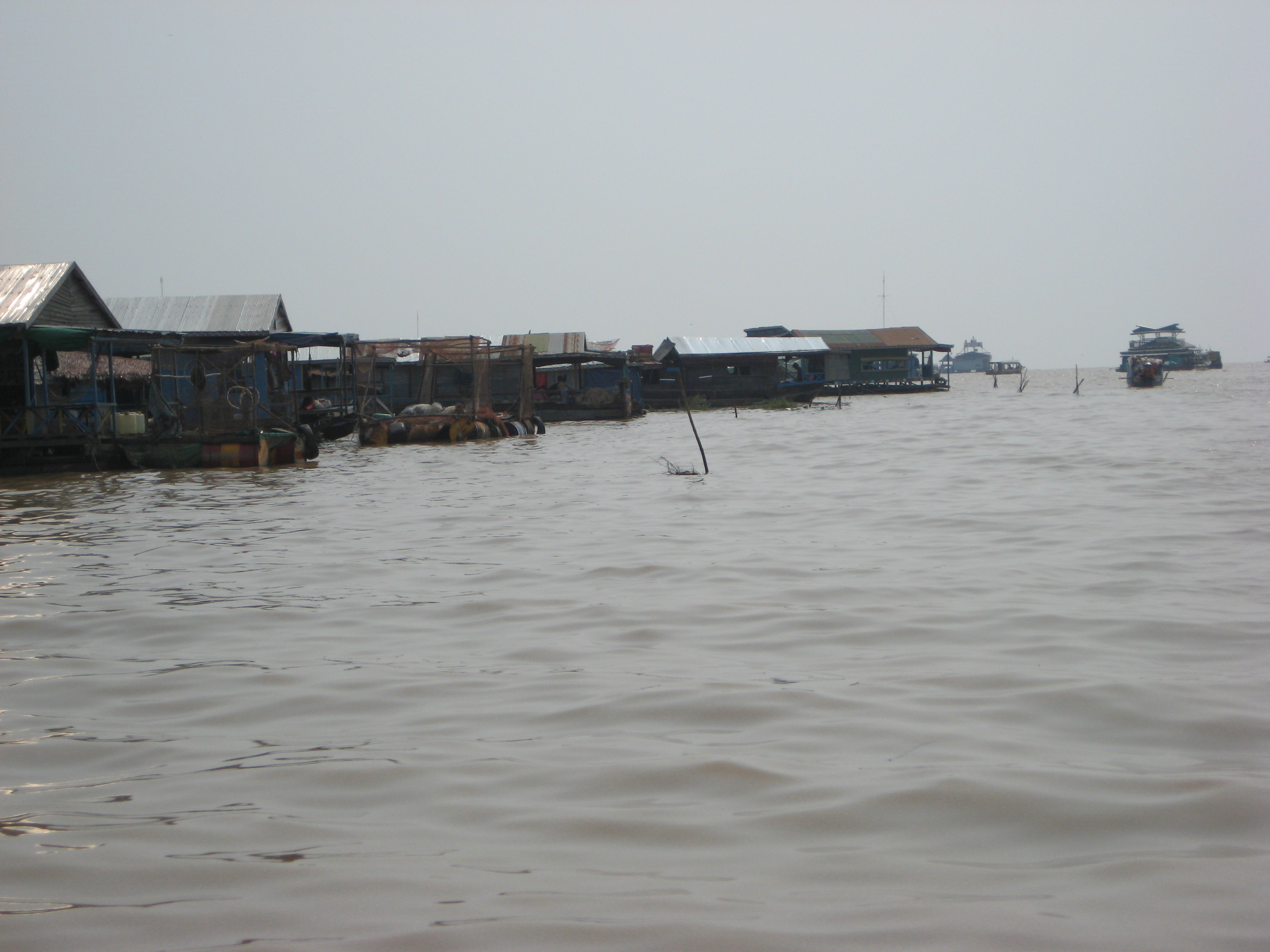 After a couple of hours there it was back to the hotel for breakfast and a rest before heading off out of town to embark on a cruise along Tonle Sap Lake (Khmer for “Great Lake”) to visit the floating villages. It is the largest freshwater lake in SE Asia and is unusual for two reasons: its flow changes direction twice a year, and the portion that forms the lake expands and shrinks dramatically with the seasons. The rise and fall of the lake is over 8 metres and consequently it floods all the areas surrounding it and almost doubles in size. The villagers therefore build their houses, schools, shops, restaurants etc. on bamboo and oil drum rafts to avoid being flooded all the time. Alternatively, they build their houses on stilts at least 8 metres over the water. Unfortunately, the cemeteries do not fair so well and lie under water for several months a year.