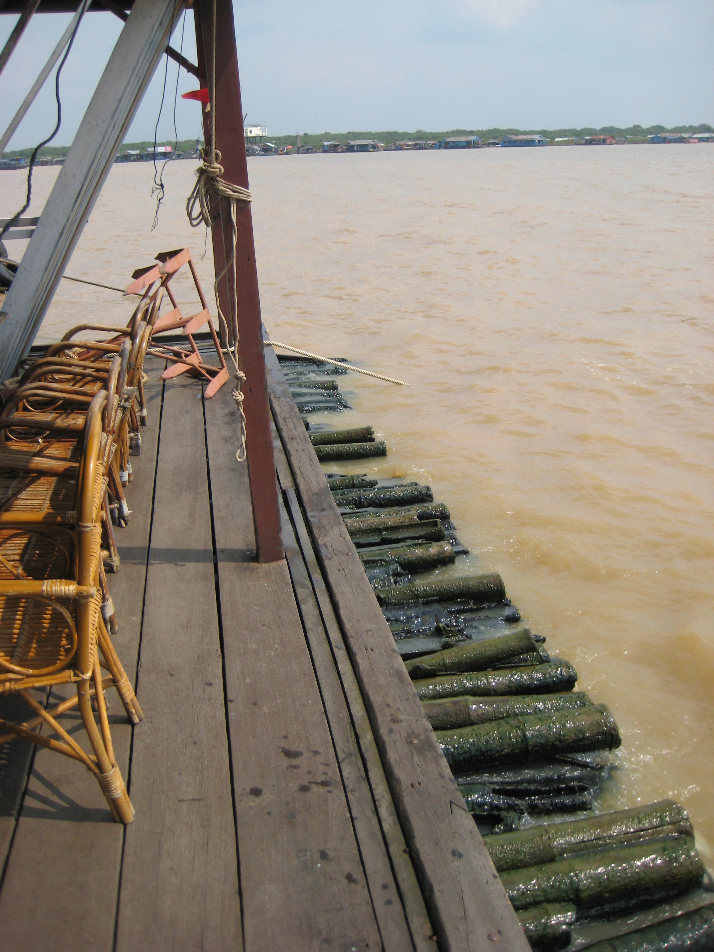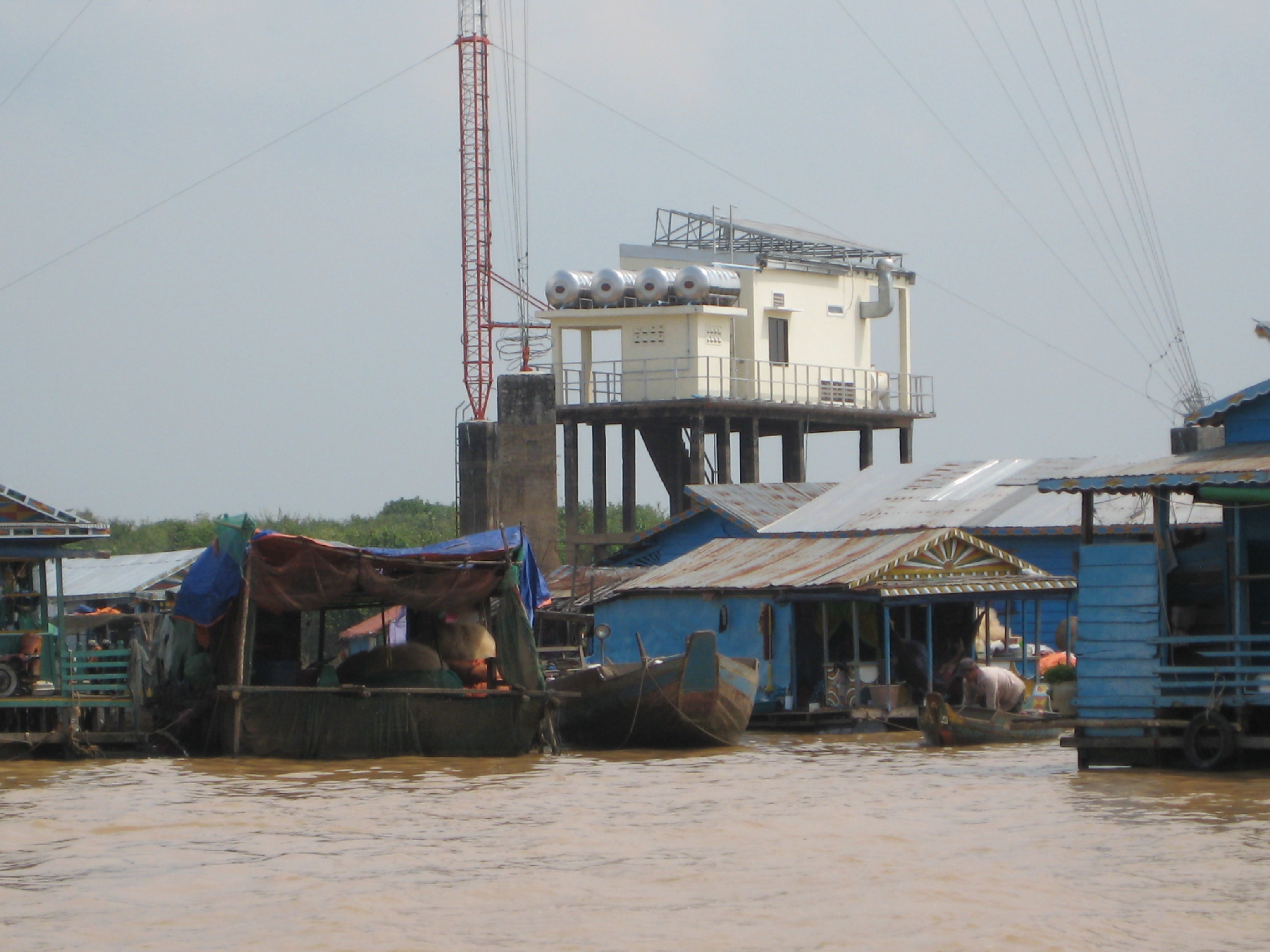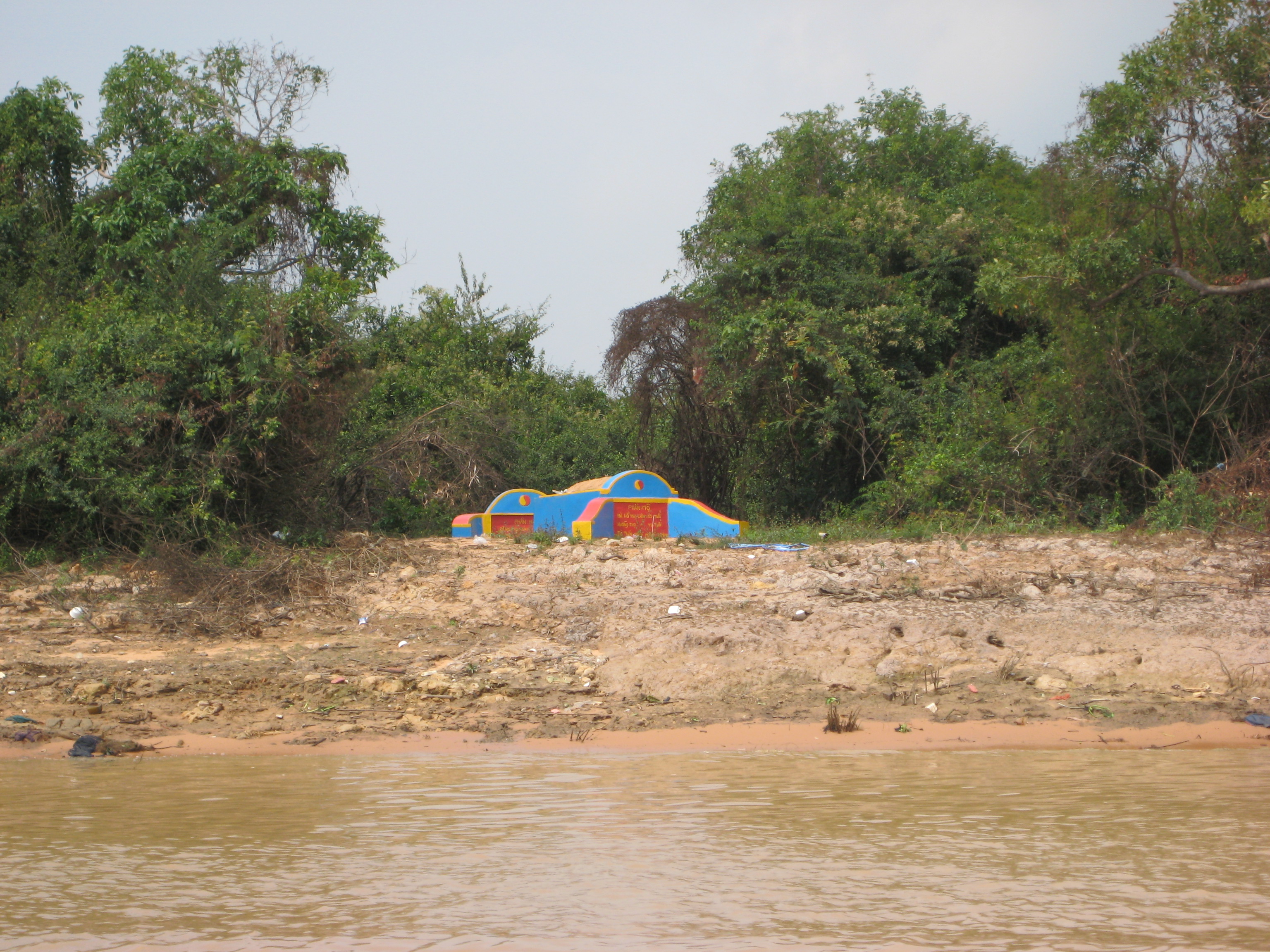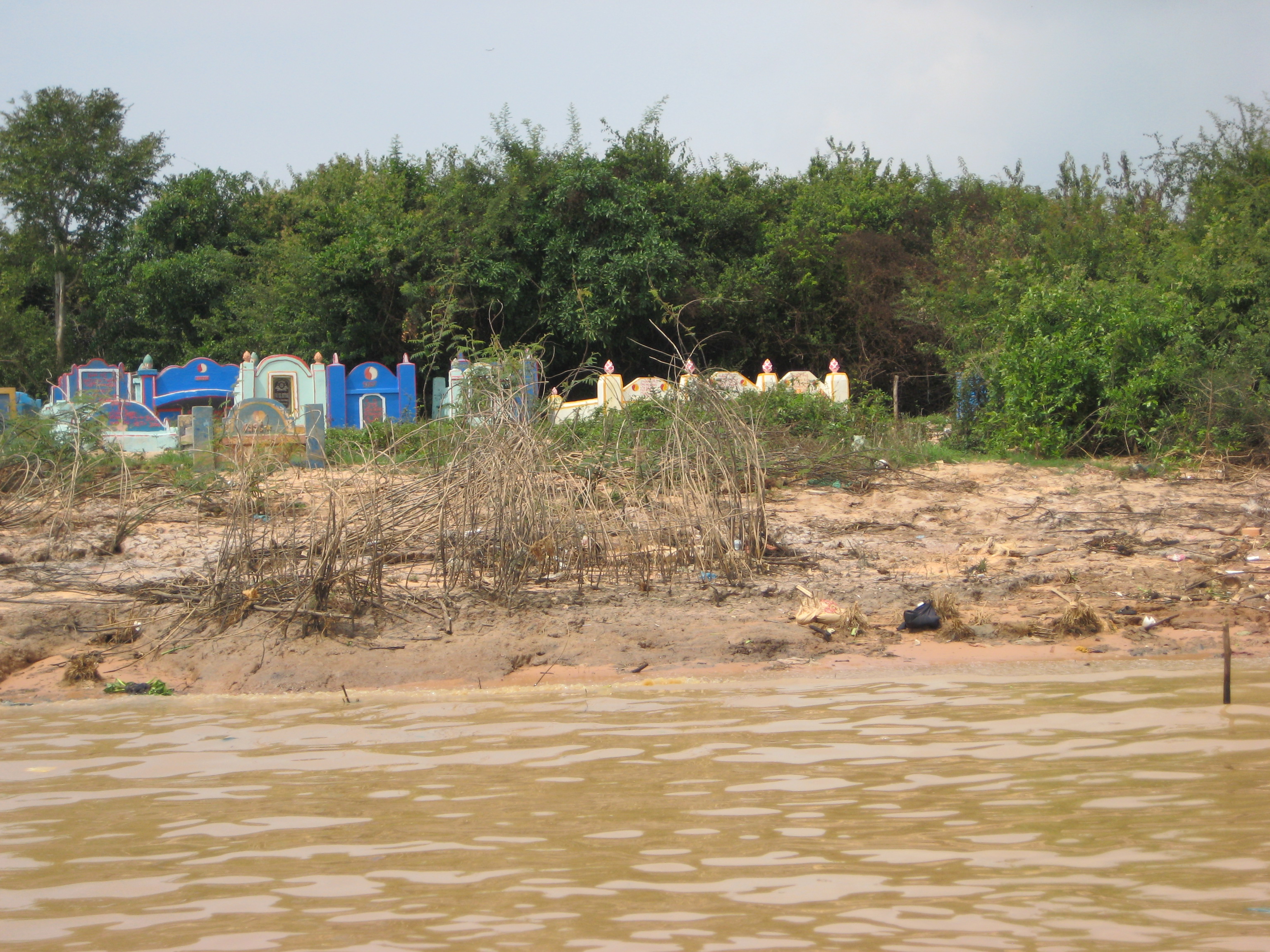 After a couple of hours there it was back to the hotel for breakfast and a rest before heading off out of town to embark on a cruise along Tonle Sap Lake (Khmer for “Great Lake”) to visit the floating villages. It is the largest freshwater lake in SE Asia and is unusual for two reasons: its flow changes direction twice a year, and the portion that forms the lake expands and shrinks dramatically with the seasons. The rise and fall of the lake is over 8 metres and consequently it floods all the areas surrounding it and almost doubles in size. The villagers therefore build their houses, schools, shops, restaurants etc. on bamboo and oil drum rafts to avoid being flooded all the time. Alternatively, they build their houses on stilts at least 8 metres over the water. Unfortunately, the cemeteries do not fair so well and lie under water for several months a year.