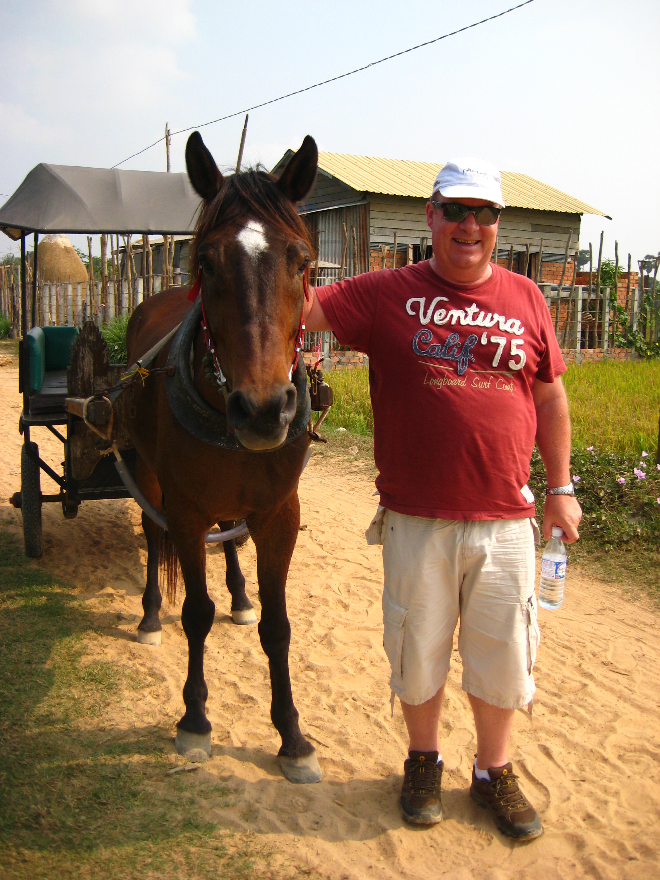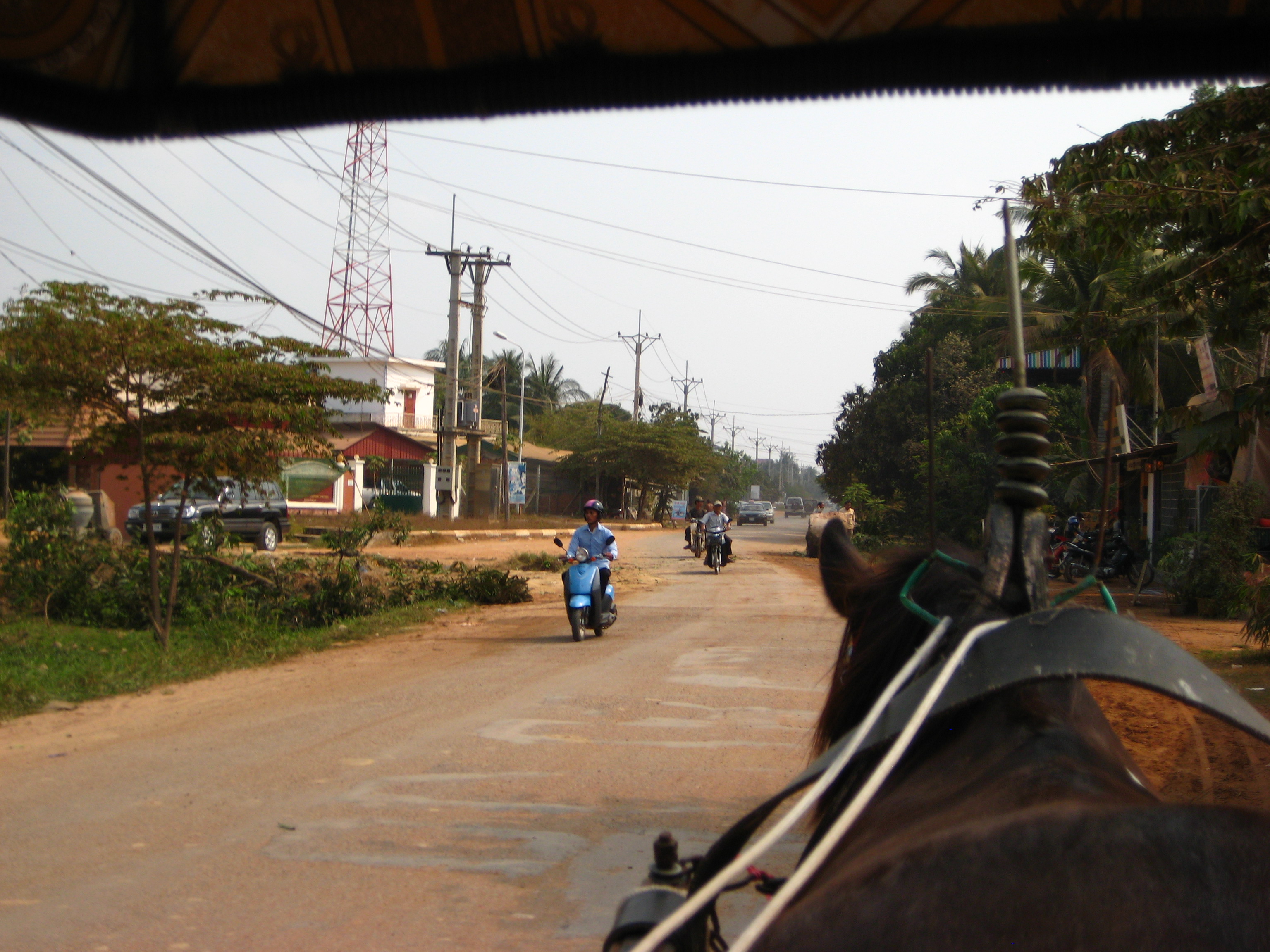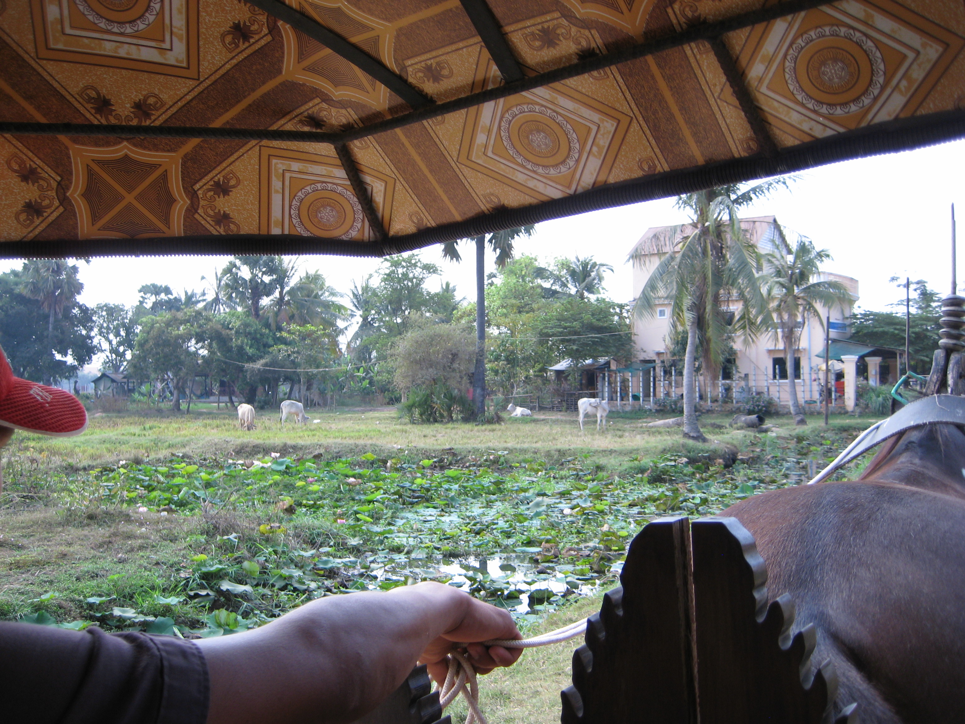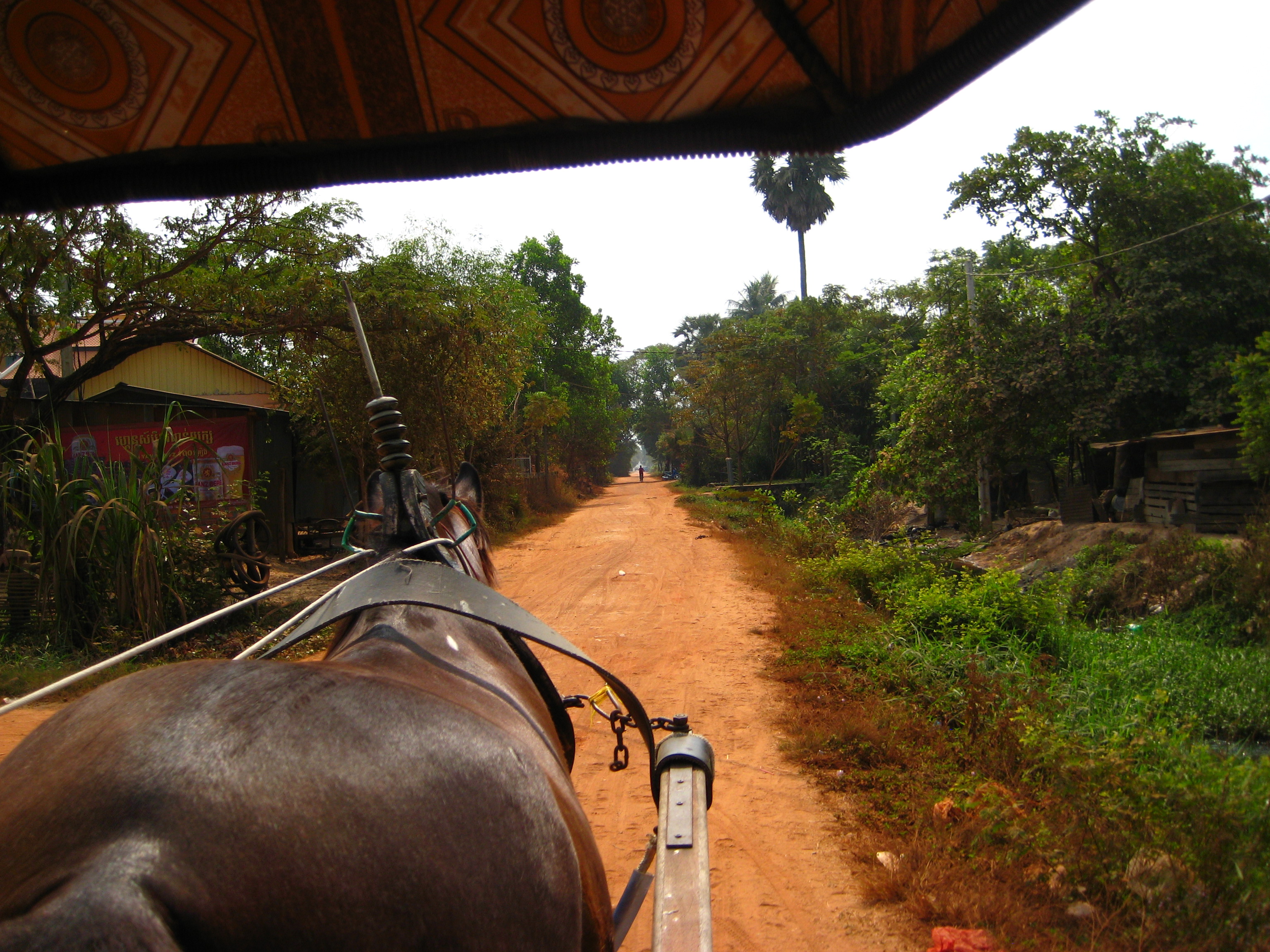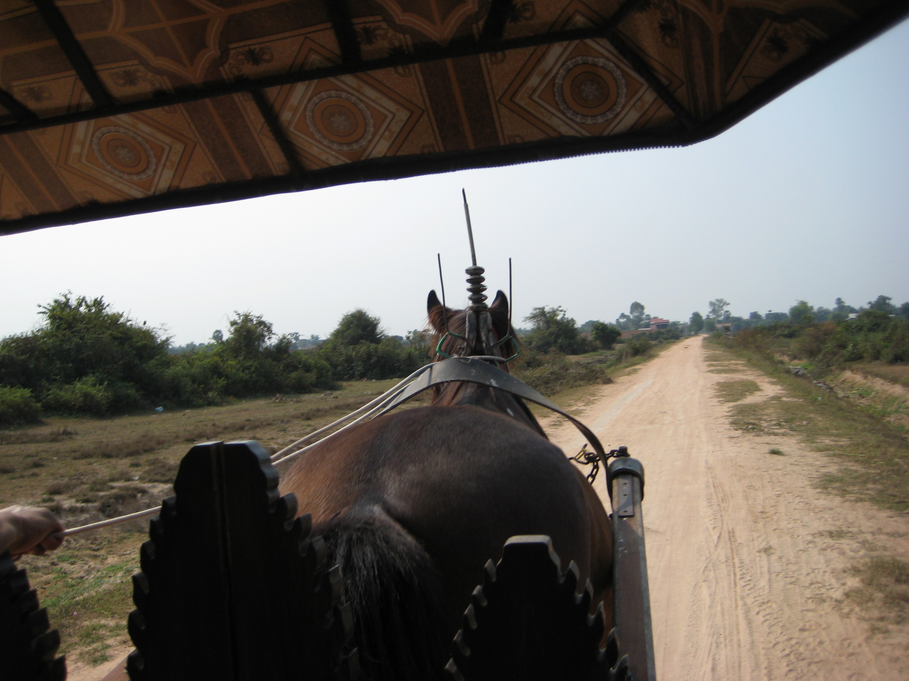 By the time I woke this morning I had felt I had been here a week after the intensive past couple of days. The leg was getting better – a good sign! This morning my guide planned a trip to the countryside to get a taste of rural life and to make it authentic he had even hired a horse and cart. It turned out the owner of the stables had a NZer employed as his chief stable hand. So off we went at a leisurely trot among the chaotic traffic of Siem Reap. Once beyond the city limits we left the road for the Cambodian pasture land, weaving our way through local the countryside. This really brought to light the under-developed side of Cambodia. All modern conveniences missing, and the reliance on good old manual labour. A hard life!