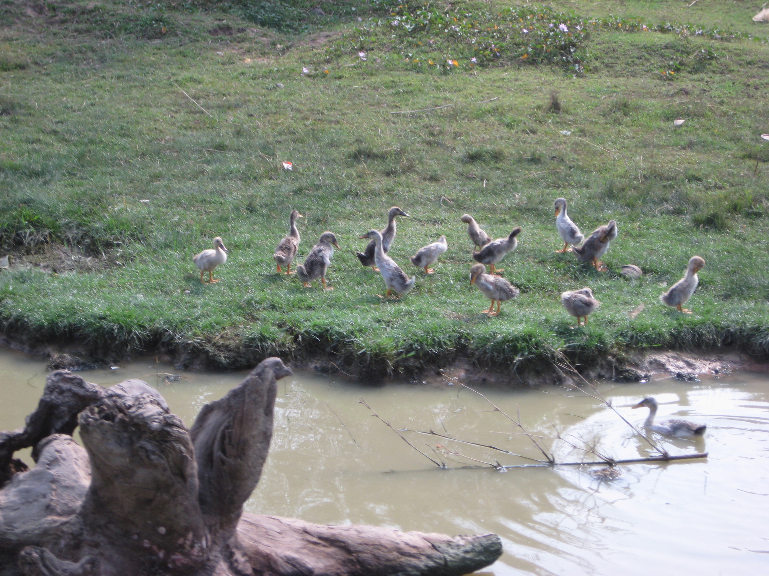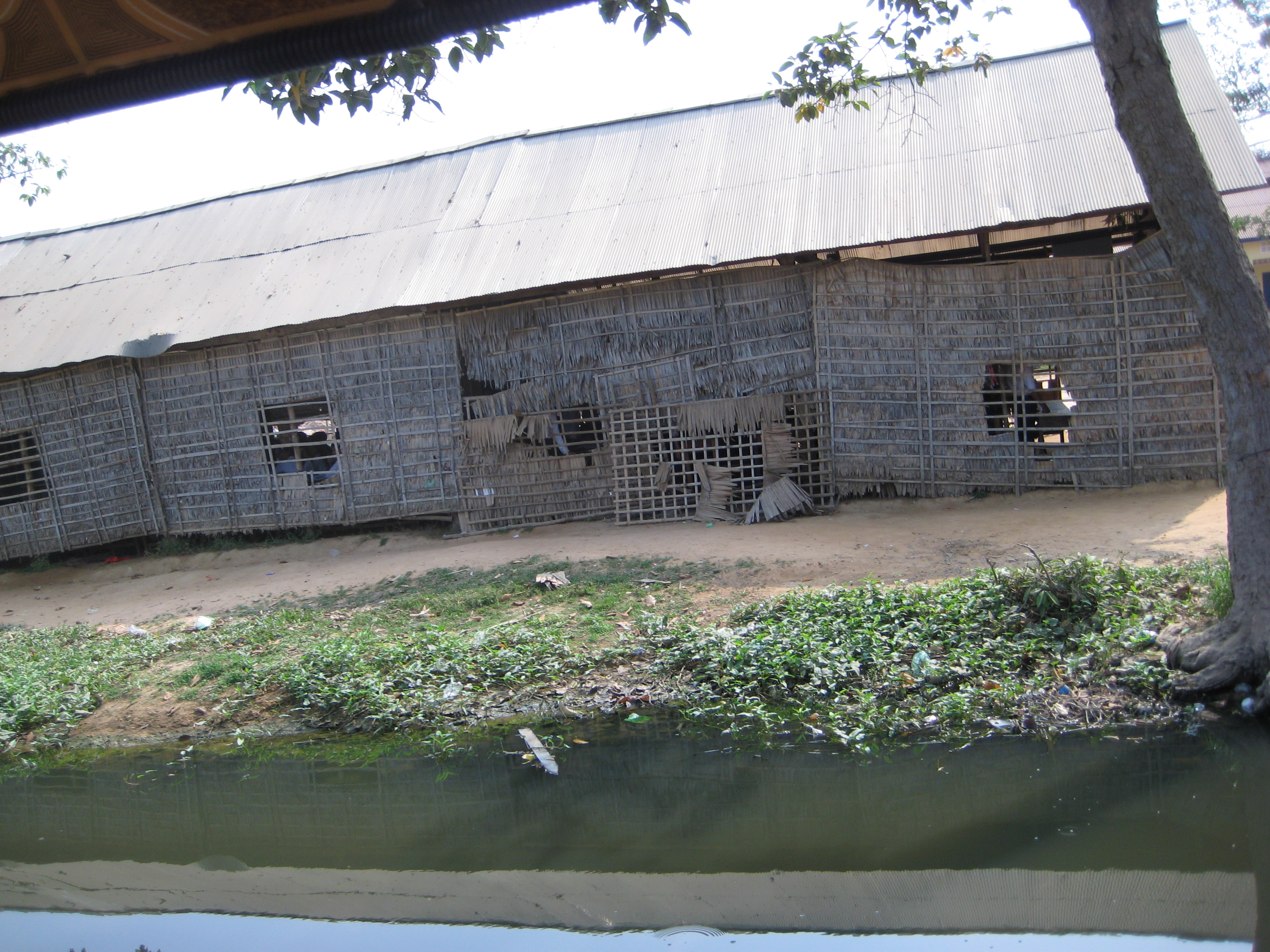We meandered among the rice paddies and fields filled with livestock including the power house of Cambodian agriculture – the Water Buffalo. The main crops grown are rice, peanuts, vegetables & mangos. As for animals it is pigs, chickens, ducks and the odd beef animal. Winter is over now in Cambodia and the summer just beginning so the landscape is very dry. The rains won’t come until August or September with the monsoon. The housing is very ram-shackled and consists mainly of bamboo and dried palm fronds. When building a house the 1st thing you do is put up a boundary wall around your property to mark your territory as the land surveys are not that accurate so you have to stake your claim. Then you have to buy soil to lift your land level above the water level of the rice paddies. By the time this is accomplished there is often no money left for the house. Even the schools are nothing more than bamboo poles, woven walls and palm roofs. All the children are immaculately clad in their school uniforms and cram themselves onto seats that are basically logs hauled into the school room. Always happy, smiling and waving.