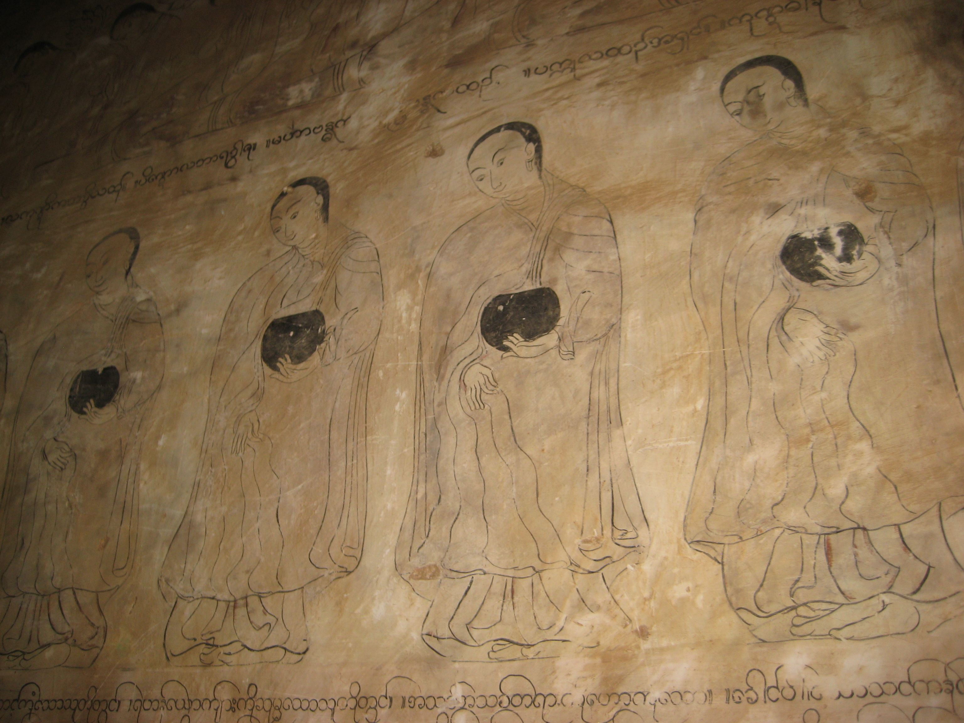 From the markets it was off to the Sulaimani (small ruby) temple (b 1183). It is renowned for its fantastic frescoes decorating the walls from the 12th century depicting fantastic scenes of everyday life. The colours and drawings remain still very vivid today after 9 centuries. A feature of the temple is that the Buddha statues are clothed in red instead of the usual gold. It is renowned for its impressive brick-laying – mortar was not used. The bricks fit perfectly together. The king threatened that if he could pass a needle between the bricks, the builders would be executed. Amazing handcraft, and something our brickies of today maybe could learn!