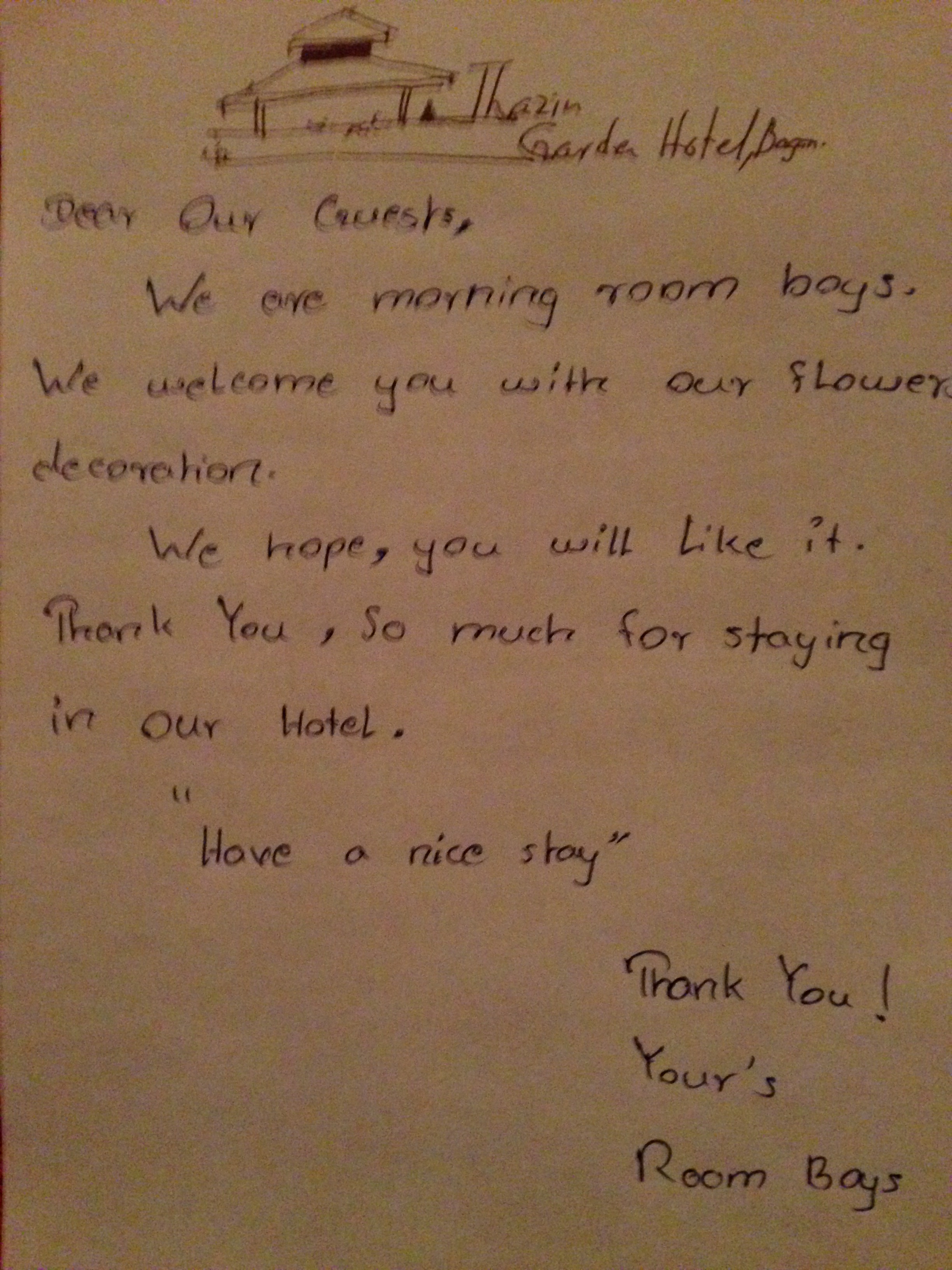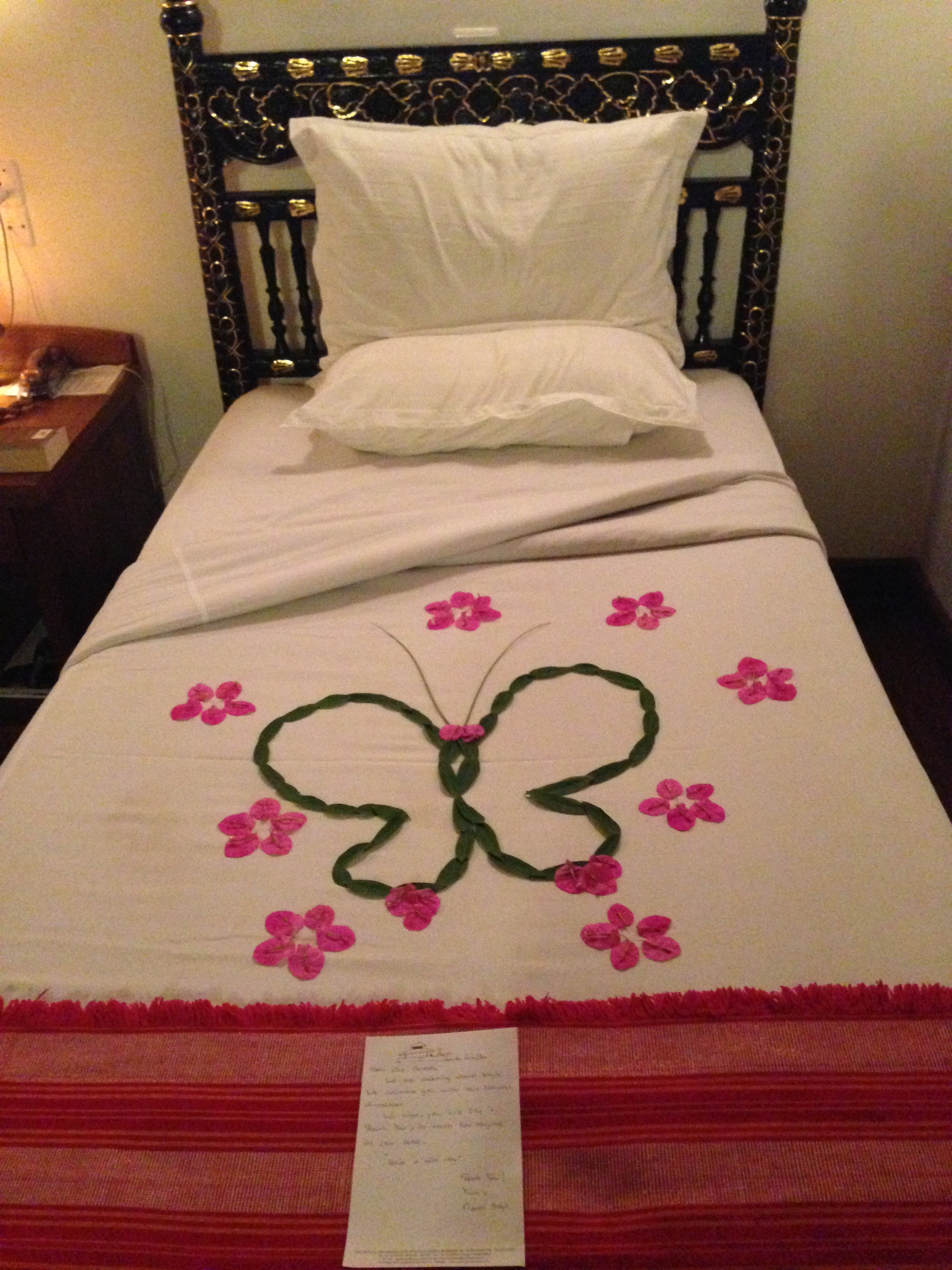 Couldn’t let it go by without sharing with you the standard of accommodation I have experience throughout Myanmar. This hotel in Bagan was the absolute best – Thazin Garden Hotel. Apartment style living with expansive verandas & gardens, bathtubs the size of swimming pools, outdoor bars, garden and roof top restaurants, electric mopeds, ?chilled? swimming pools :o, and thoughtful “house boys” 🙂 who decorated your bed each night with flower petals and left hilarious little notes. 🙂