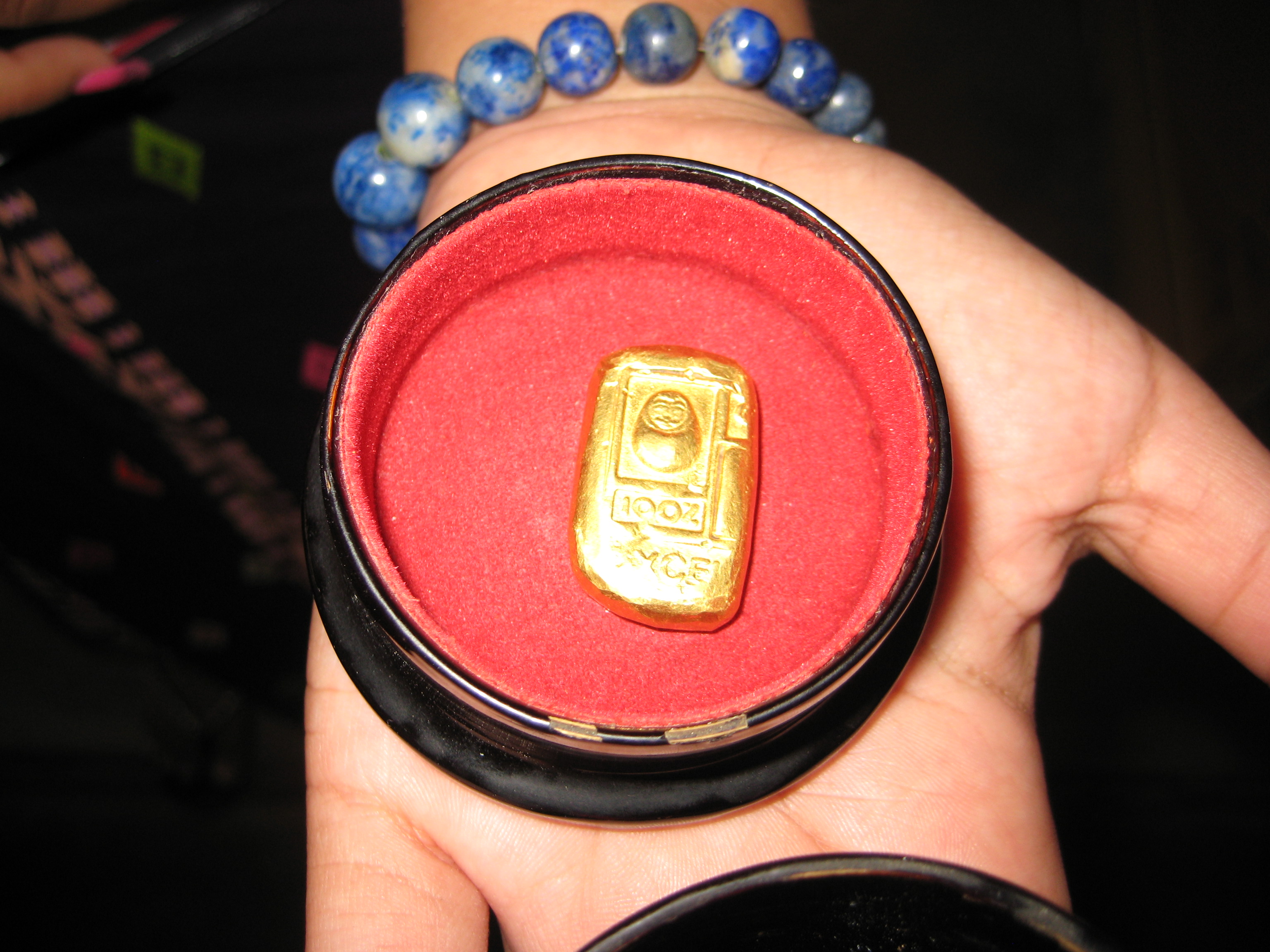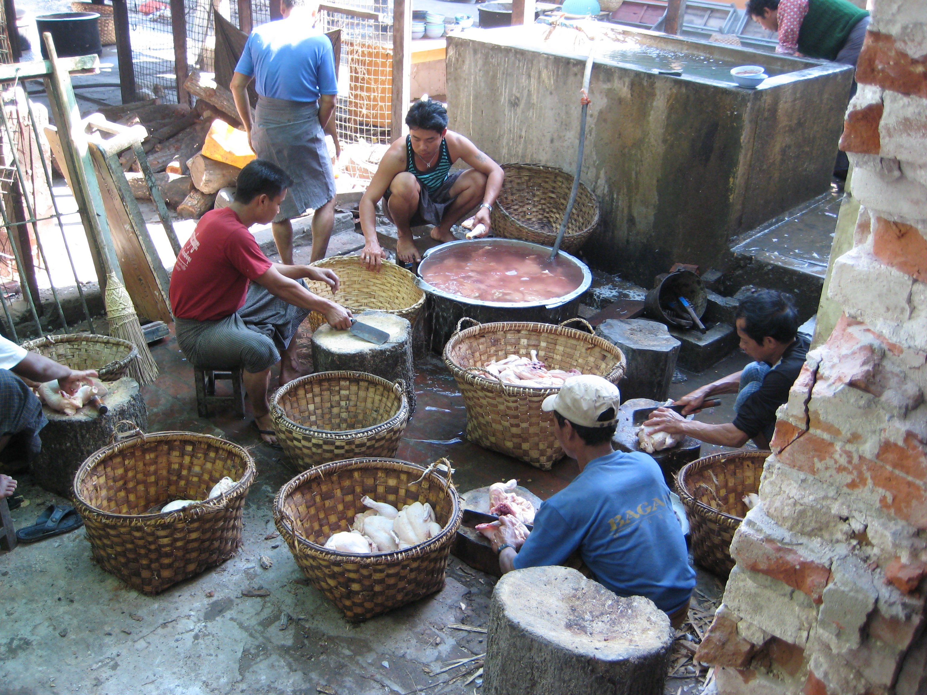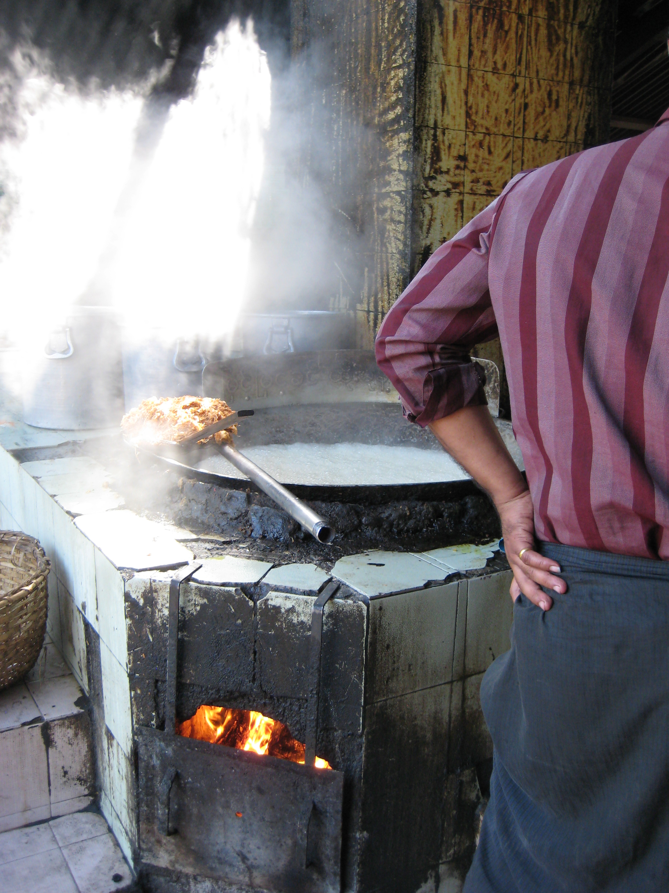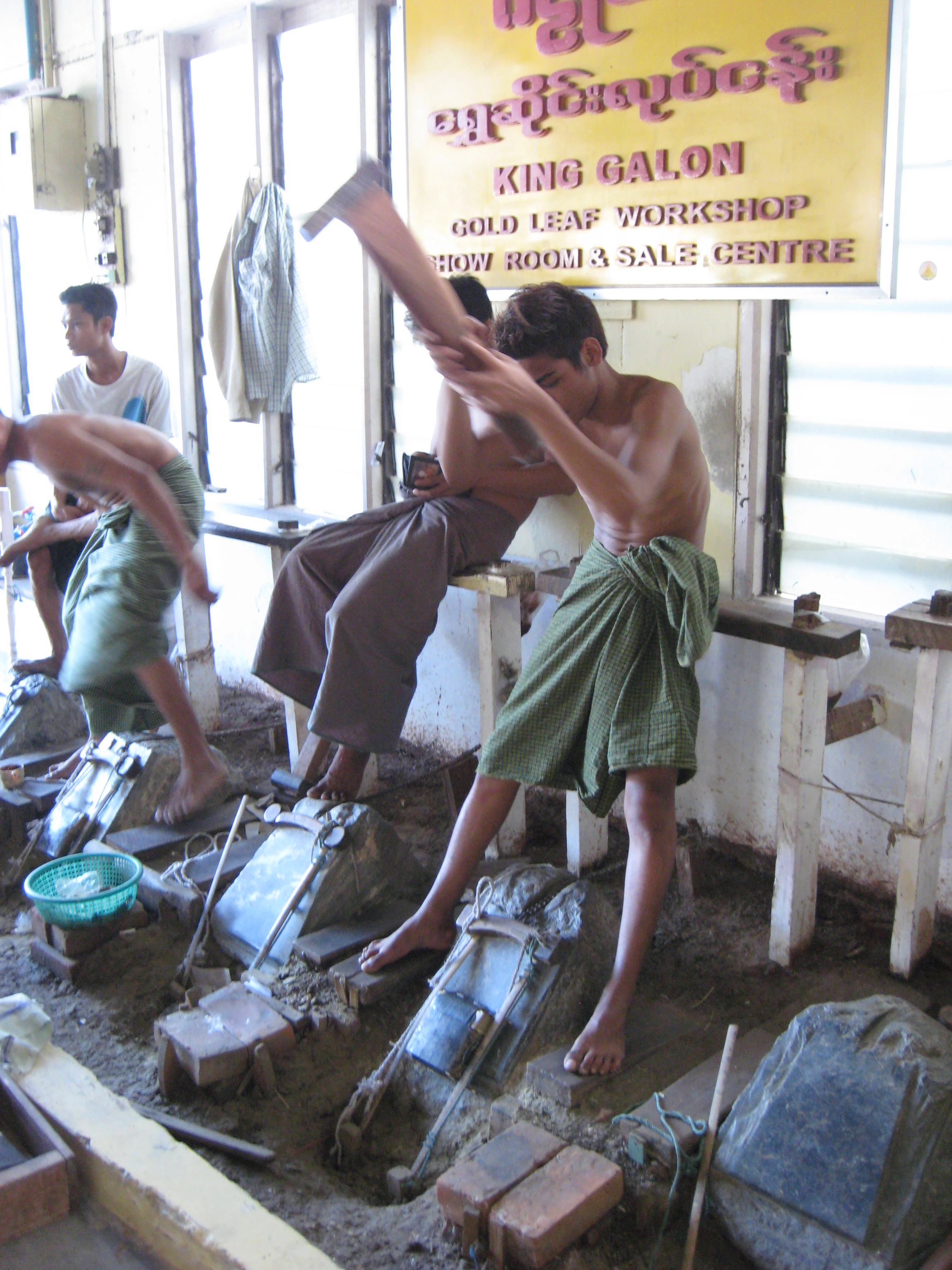 Suitably ensconced and refreshed from my hotel visit, it was time to take up my afternoon’s activities. It started with a stop at the bank to exchange some money. It feels remarkable to leave in a few hundred dollars and get back a couple of hundred thousand Kyat (chat). With a couple of hundred bank notes in hand one feels decidedly rich. Next door to the bank was a workshop making gold leaf. They take small ingots and roll them out in a press to fine ribbons. The ribbons are cut into 1 cm squares and then about 100 are layered upon one another separated by bamboo paper, wrapped up in leather and then hammered by a very fit man for about 3-4 hours. The constant hammering flattens the gold until you get the leaf. The heat generated in the hammering is 50-60 C and once the hammering starts the poor guy can’t stop until he is finished otherwise it is ruined.