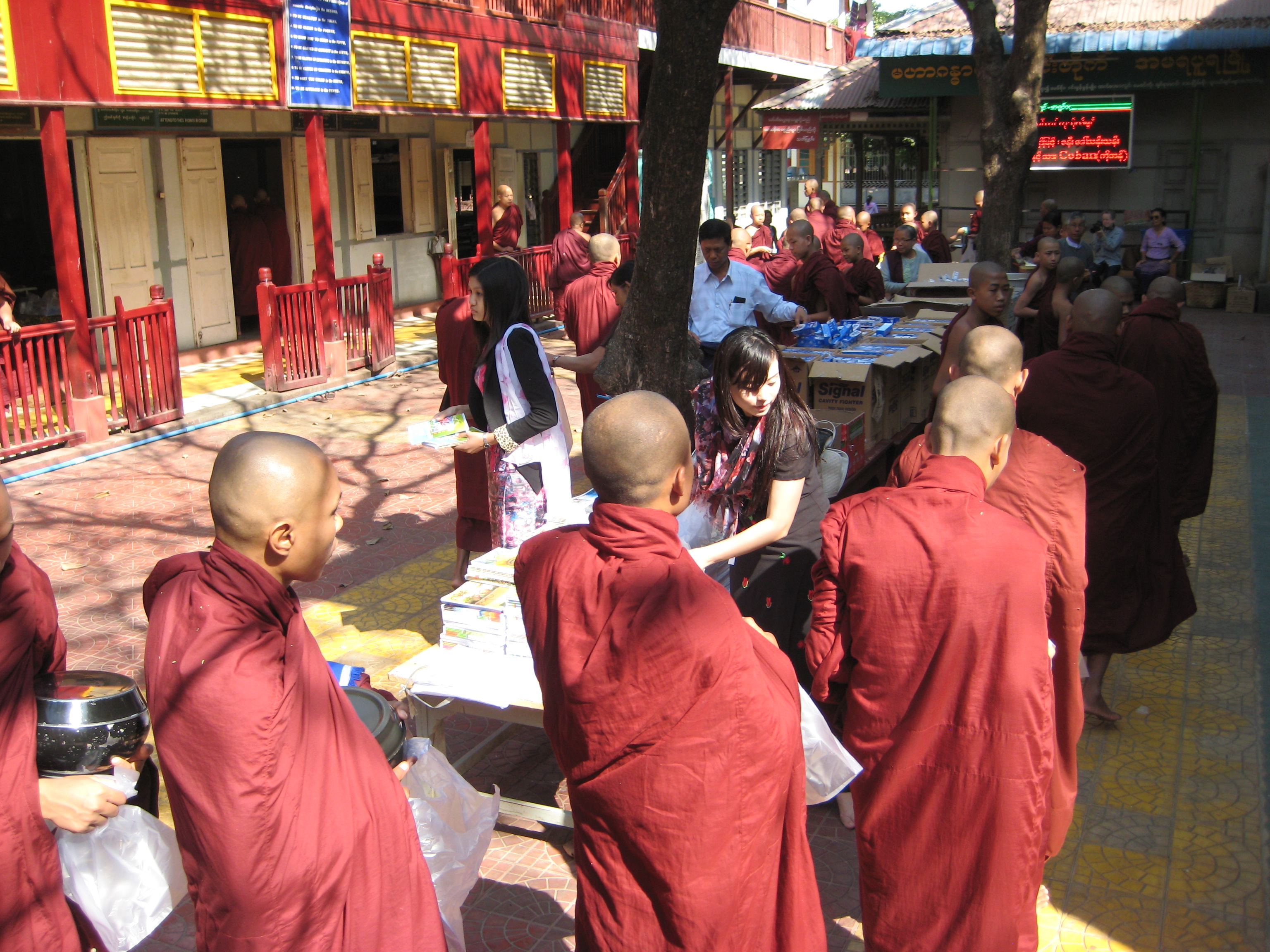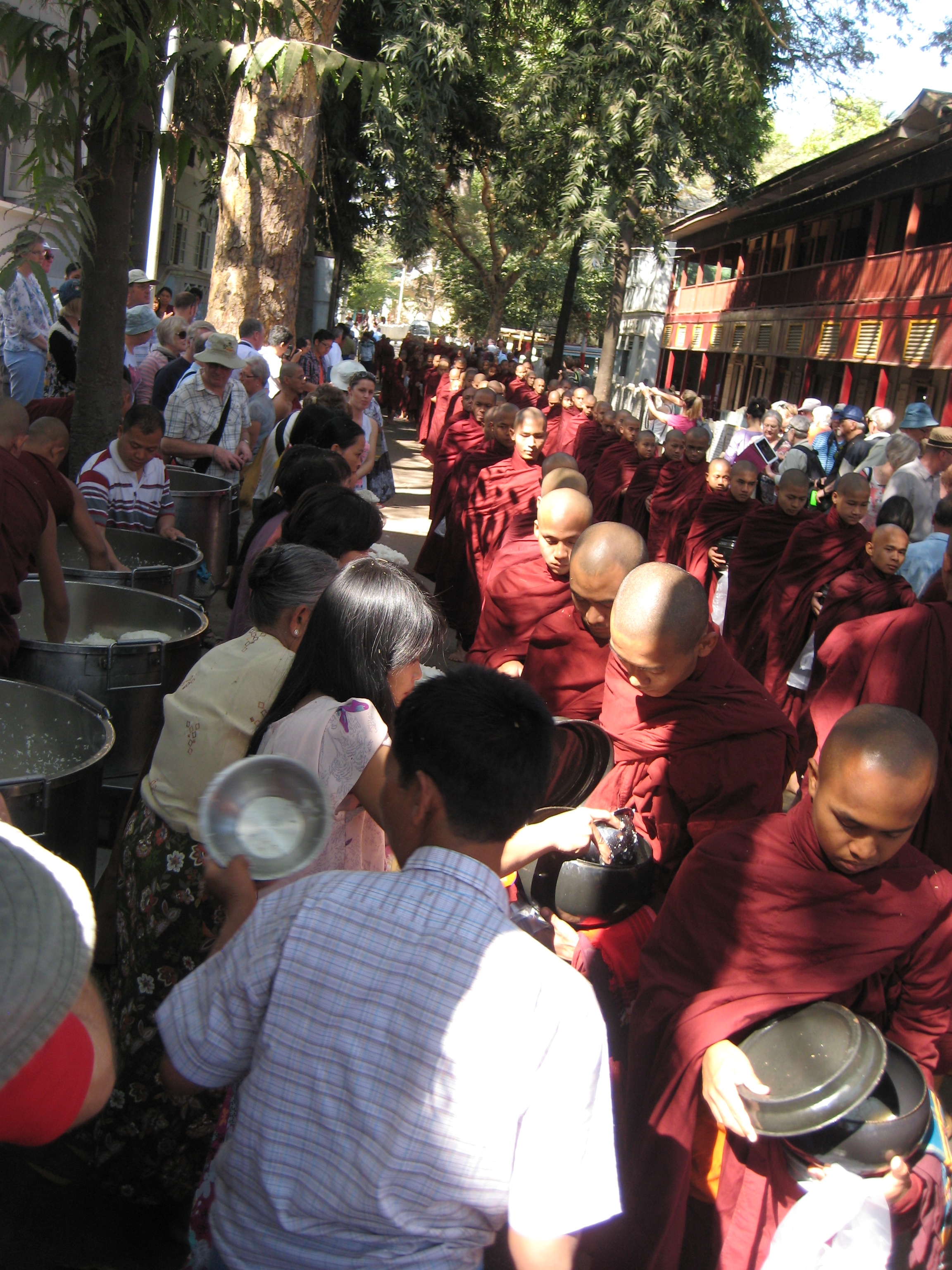 Another early morning, this time from Bagan to Mandalay. Myanmarian flights not quite Kipling’s road to Mandaly. The dutiful guide was awaiting my arrival where she whisked me off to breakfast in the ancient royal city of Amarapura. This was followed by a visit to the Mahagandayon Monastery, one of the largest Buddhist teaching monasteries in Myanmar. Here I learnt you could become a monk, stay as long as you like and leave whenever you felt like it. A lot of the poorer families send their children (boys & girls) to the monasteries during the summer break from school and this way they avoid the cost of feeding them over the summer. Traditionally, one should be a monk at least three times during ones life – as a child, as a young man and as a pensioner. We arrived as the monks were about to be fed and as the people donated daily gifts to them.