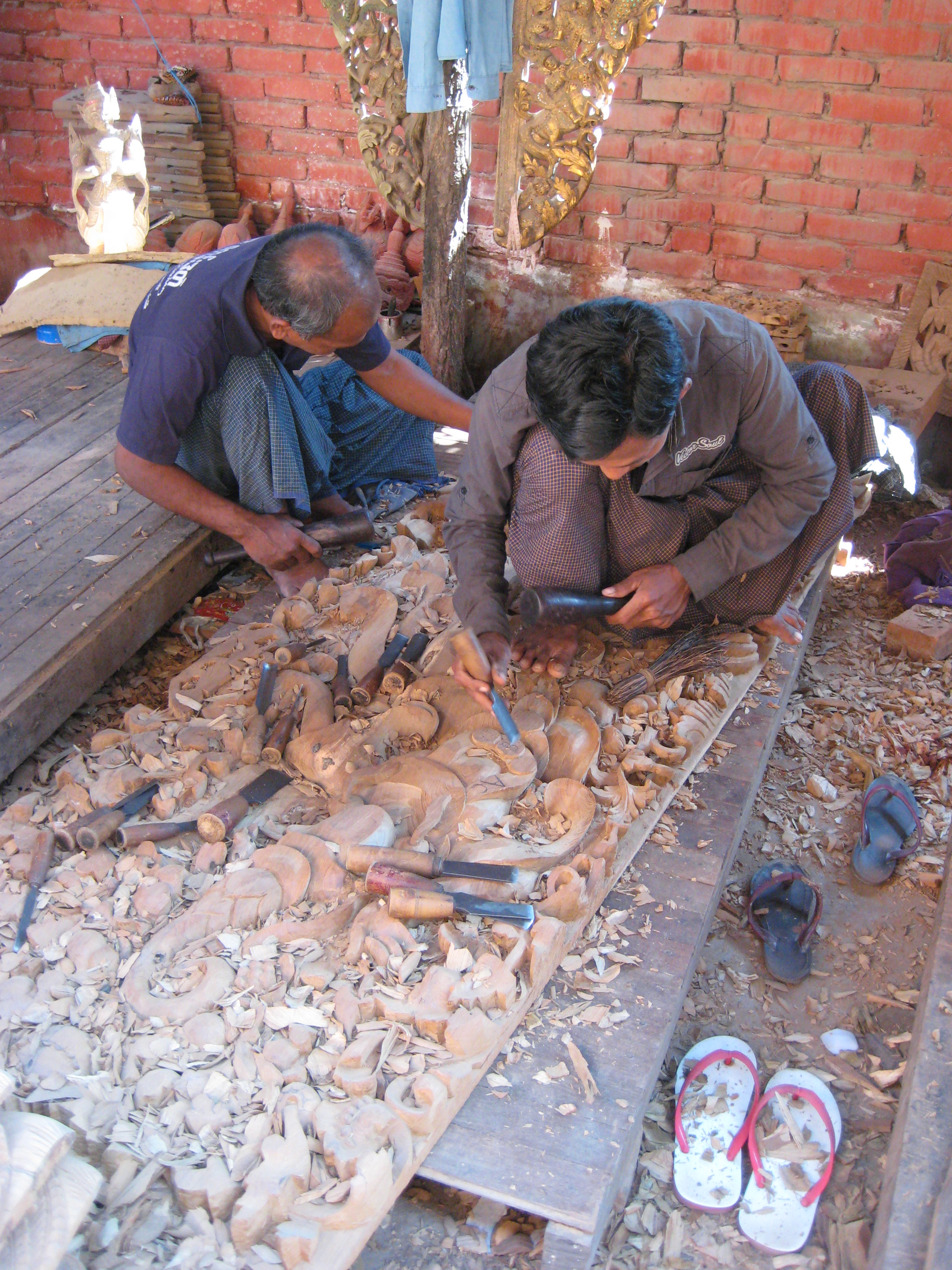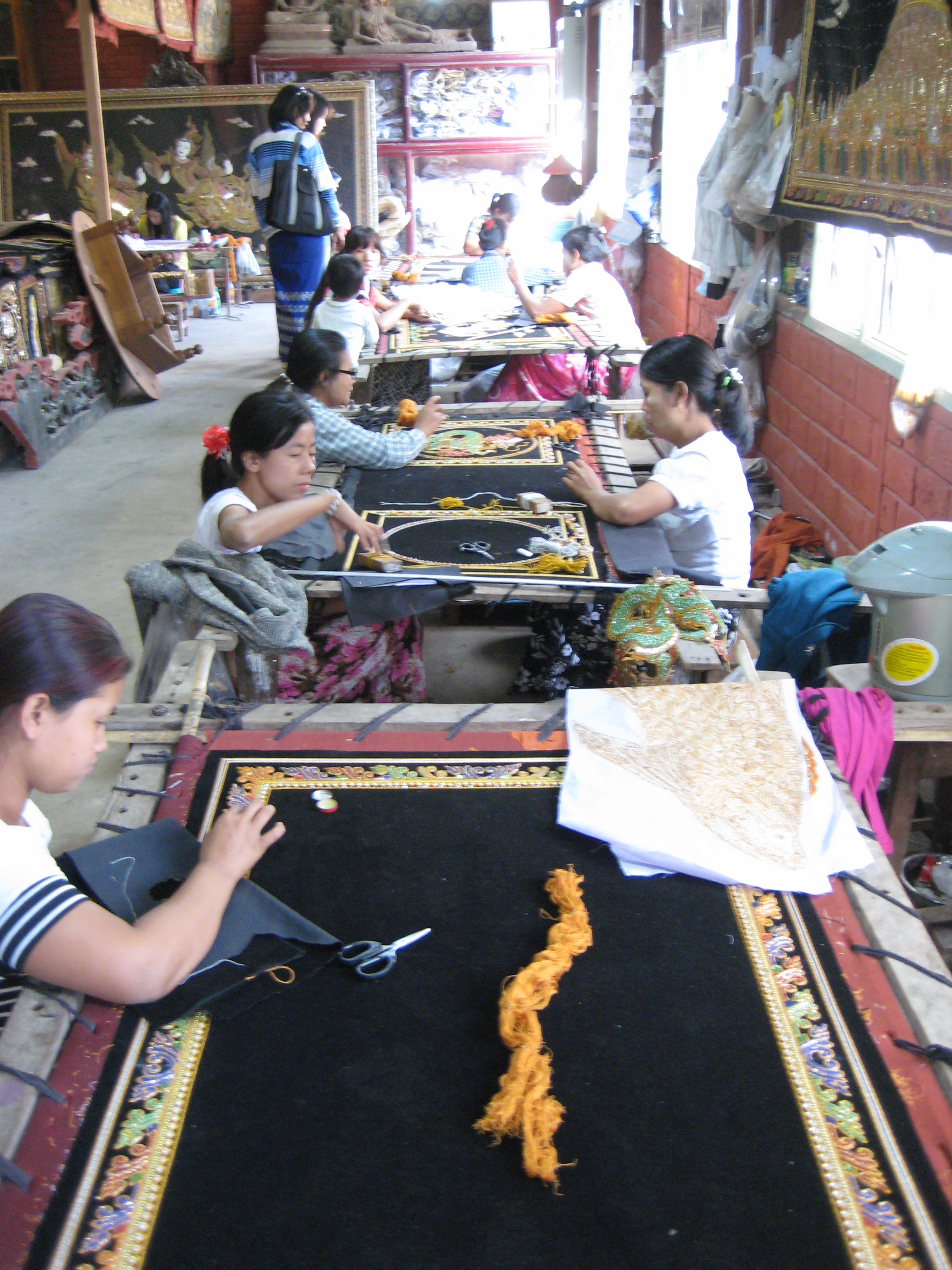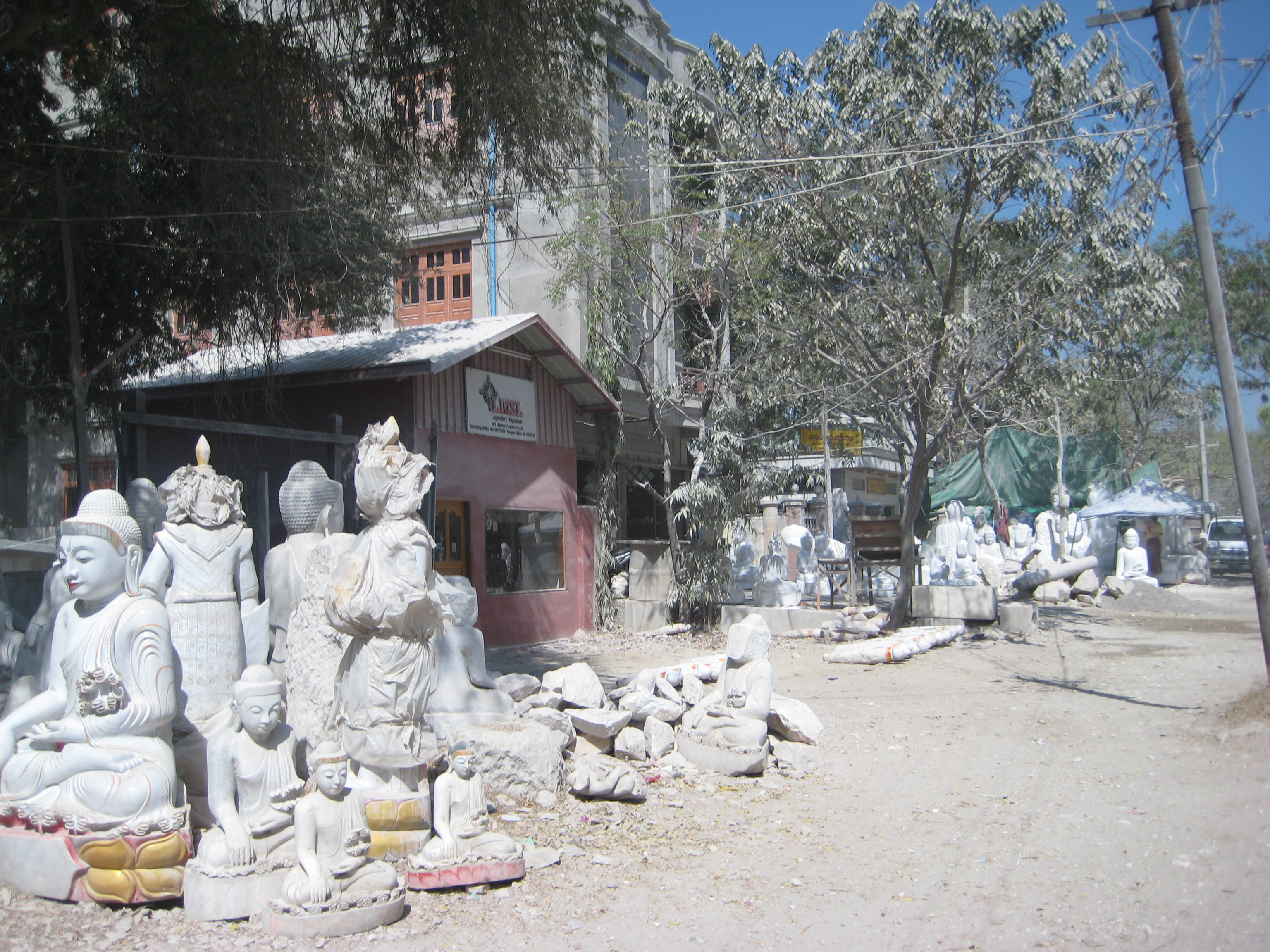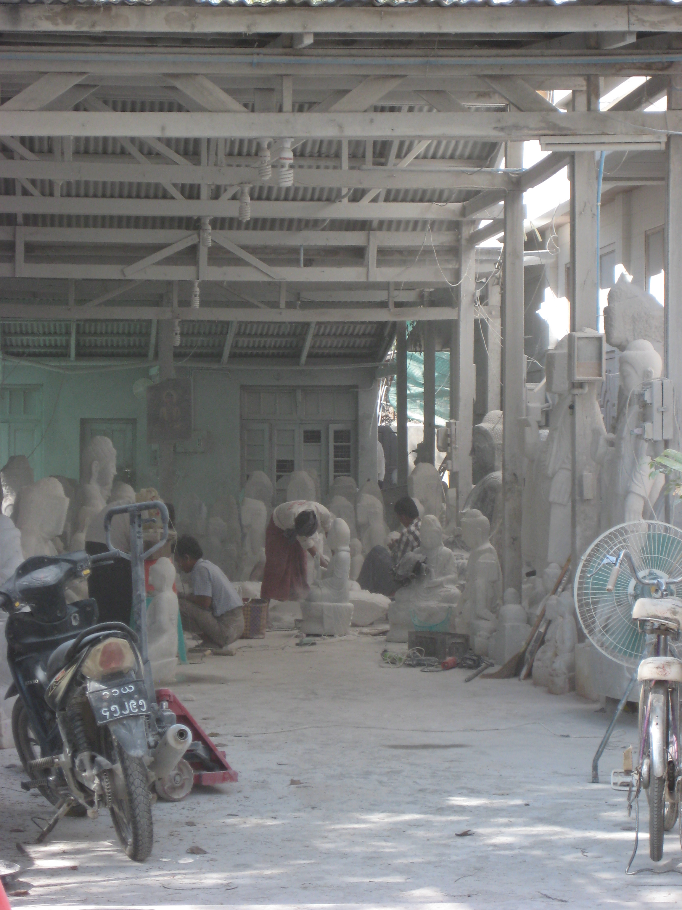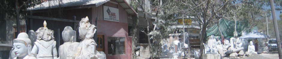 From the monastery it was on into Mandalay, the second-largest city and the last royal capital of Burma. Before lunch we made visits to the industrial handcraft areas that Mandalay is famous for. Colourful silk weaving, fantastic teak woodwork hand-carving, labour-intensive hand-embroidered tapestries of gold thread, and mammoth marble and alabaster statues. The dust from the marble factories filled the lungs and covered one in a fine white powder.