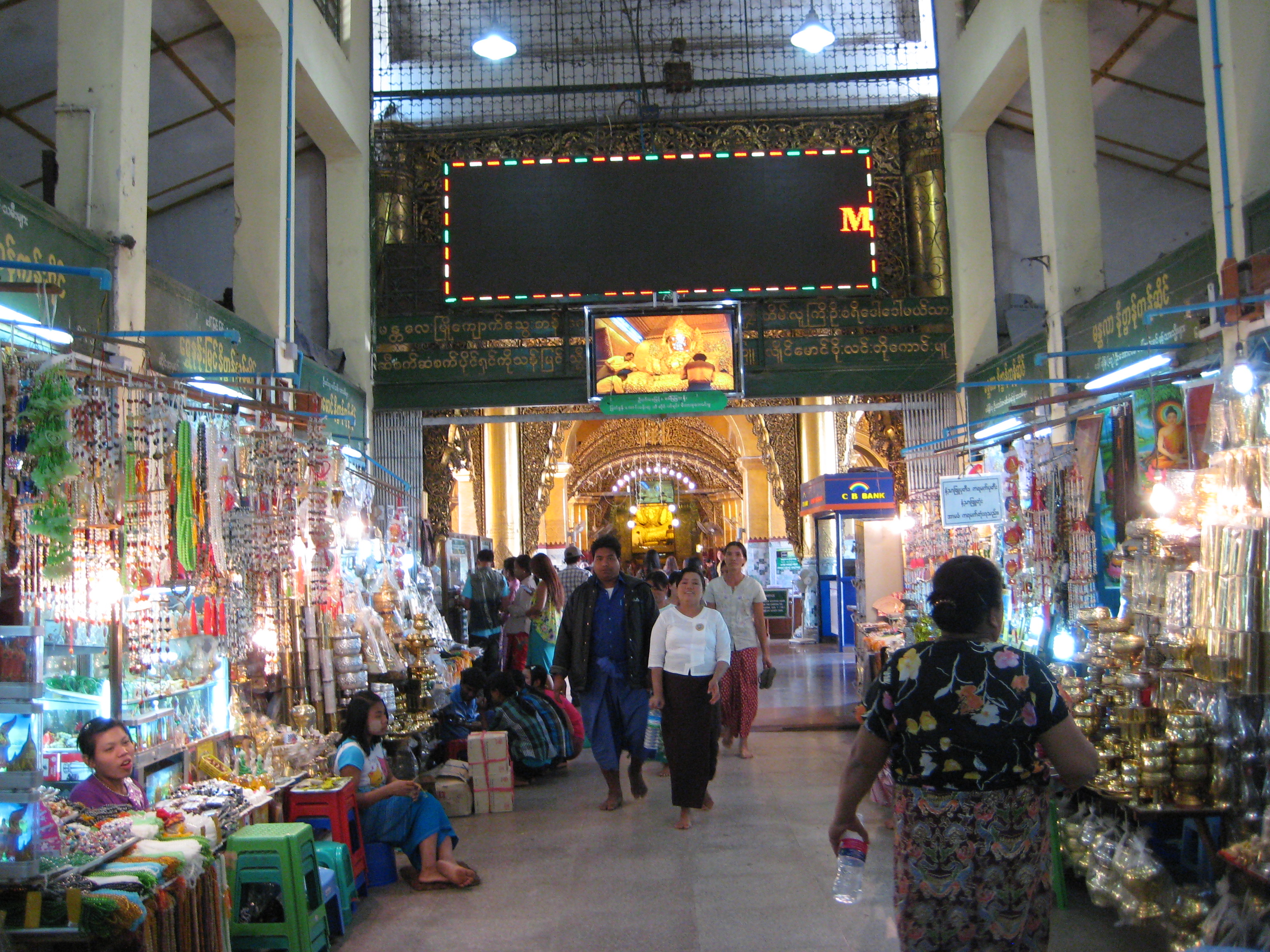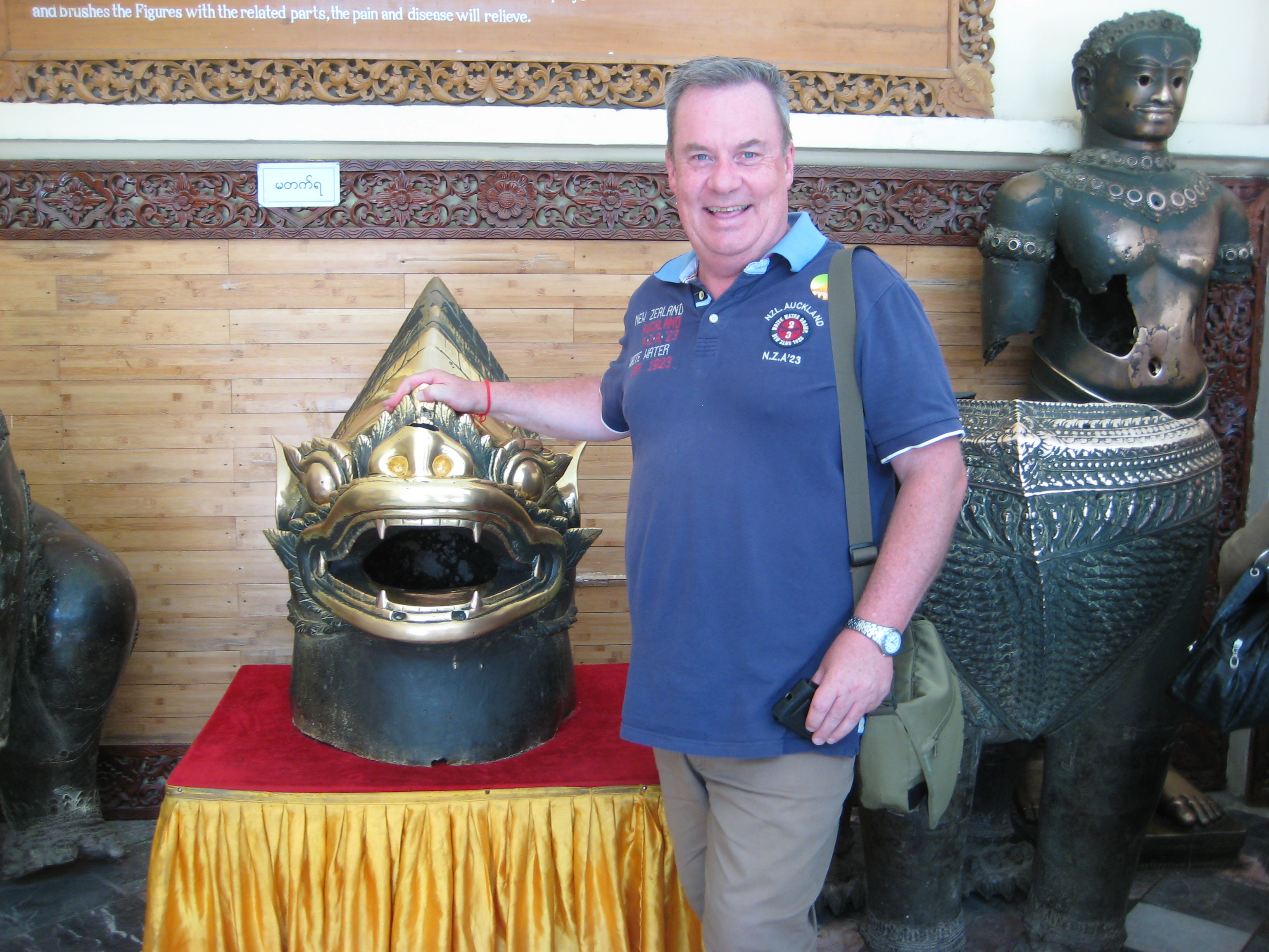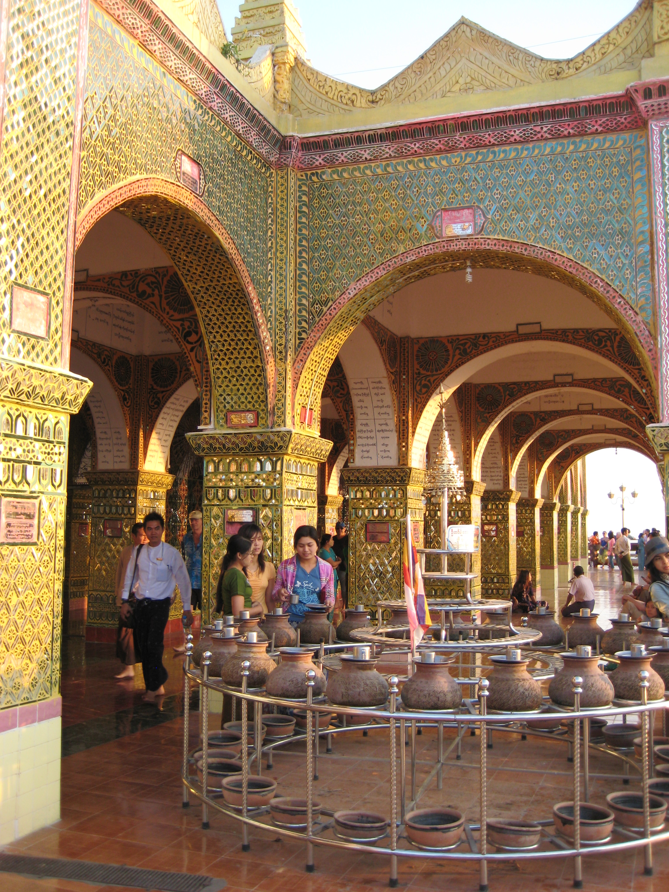 From there it was on to the Mahamuni Temple with the Maha Myat Muni Buddha. This Buddha statue is most revered as it is one of the three Buddha statues made within the lifetime of the living Buddha (4th century BC). The other two being in India. It was transported to Mandalay in the 1st century BC, a feat in itself considering the mountains along the way. The 4m high-seated image is cast in bronze and weigh 6.5 tons and crowned with diamonds, rubies, and sapphires. As it greatly revered, one should not visit without adding some gold leaf to the actually statue. Not being one to miss out, I took the opportunity to add a little gold of my own, however, I was surprised that this chance was limited only to men – equality is yet to make it here! Buddhists are so devout that countless thousands of devotees have applied gold leaf to gain merit and the image is now completely covered with 15 cm thick layer of gold and its original shape has become distorted. With gold leaf still clinging to my fingers it was off to lunch and my hotel overlooking the the Arrawaddy River (Kipling’s Burma Road).