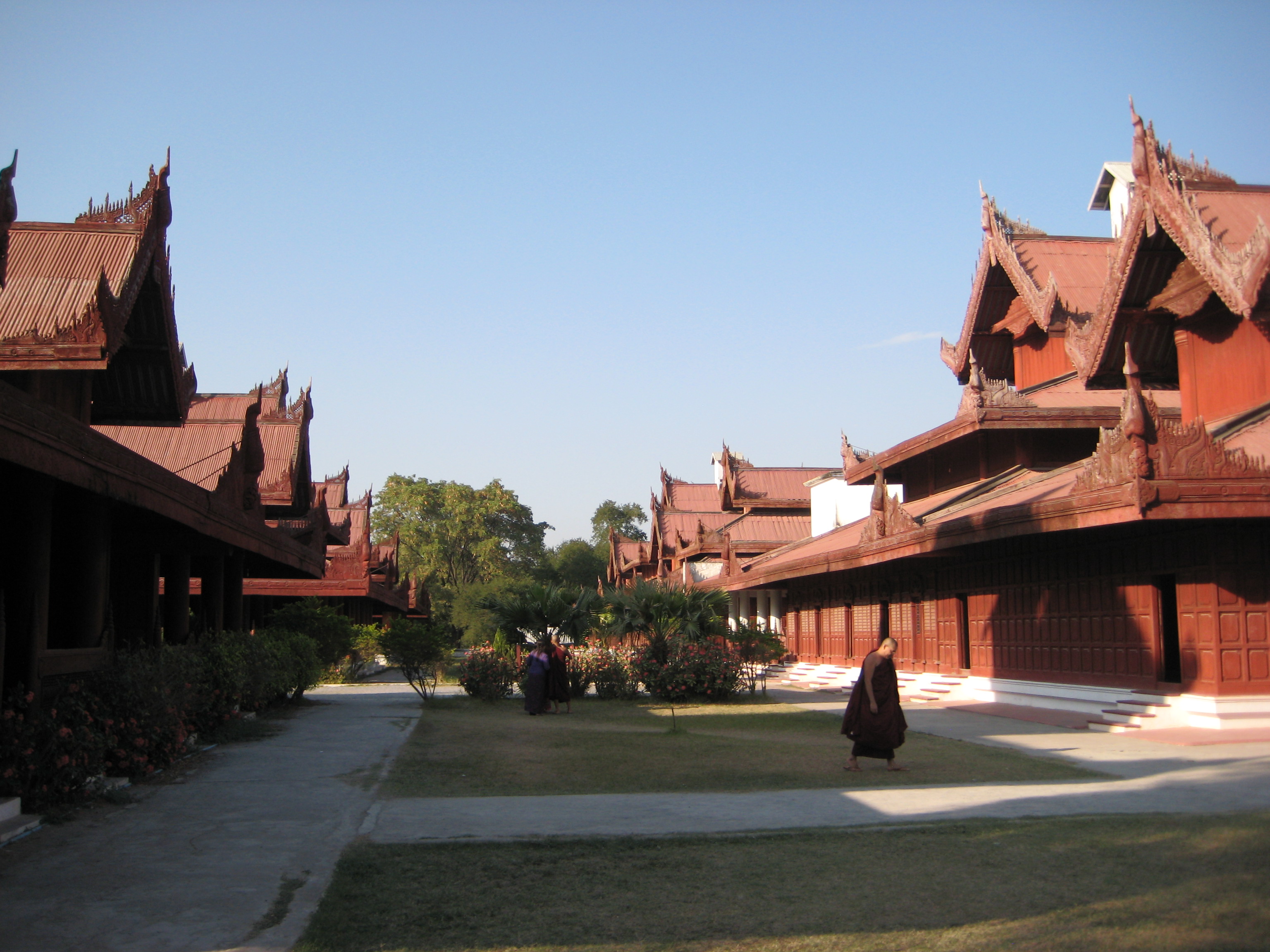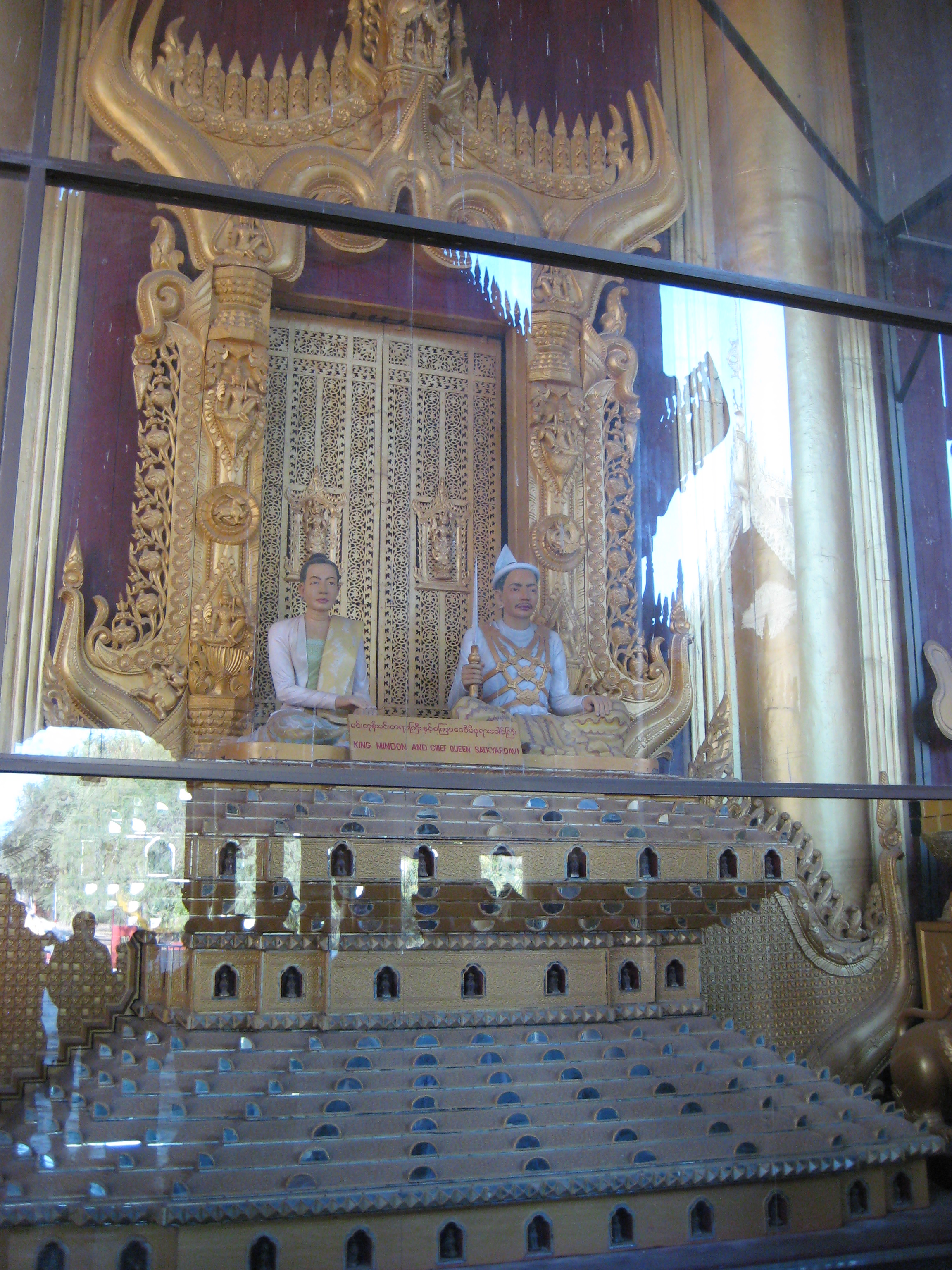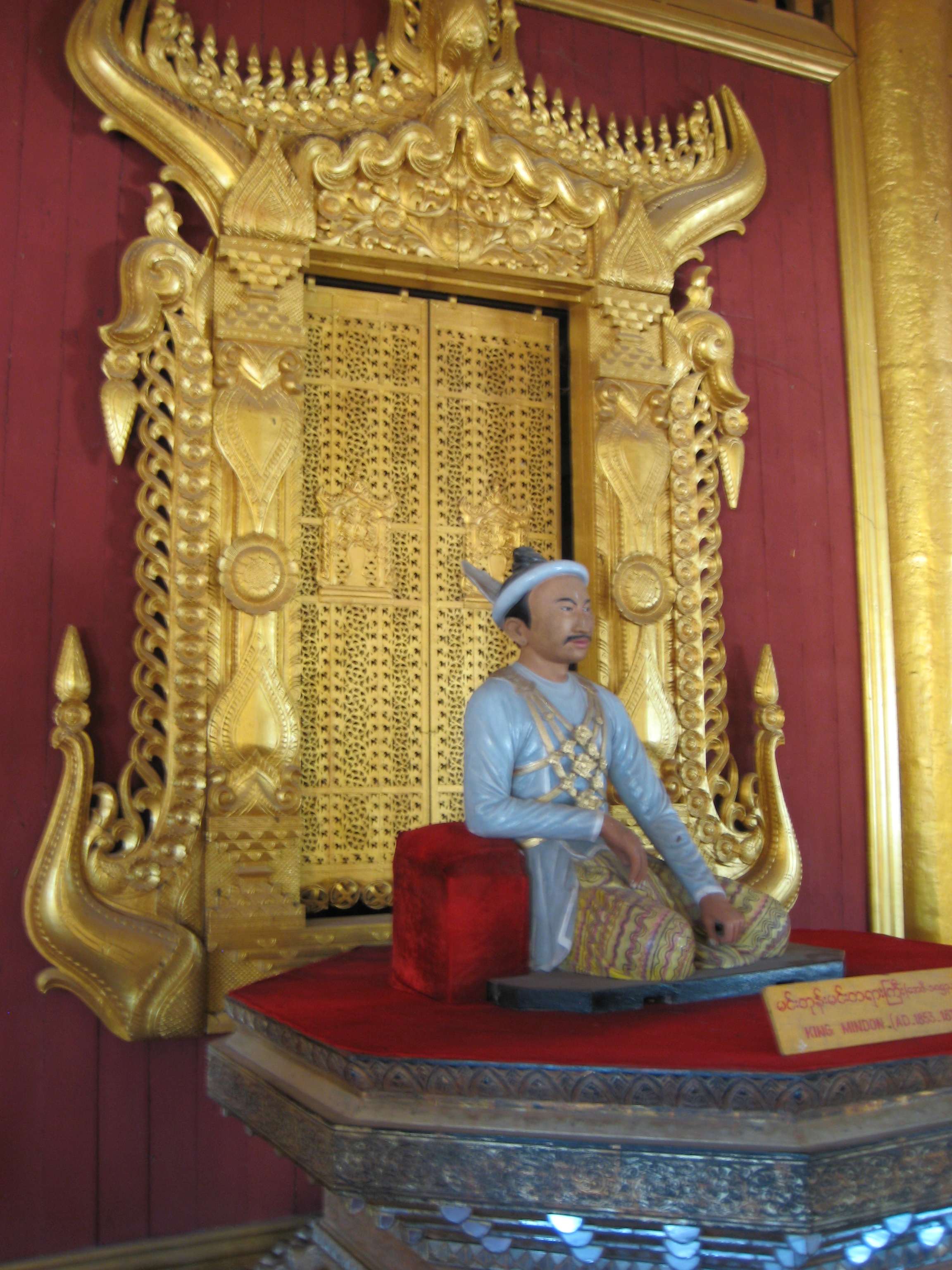 After having seeing my fill of exercise for the day, it was time to hop into my chauffeur-driven limo and off to the Mya Nan San Kyaw, the Royal Palace of Mandalay. The palace is a square 2 km x 2km, surrounded by a moat and built by King Mindon in the mid 1800s. It was home to the last Burmese King (King Thibaw) before he was routed by the British in 1885. Barely finished before it was lost and most of its artifacts were looted and are now in the V & A Museum in London. With its lavish teak pavilions covered in gold leaf and the beautiful glass palace (interior covered with glass mosaic) at the centre containing the Bee Throne, it unfortunately is all a facade. It was burnt down during the British-Japanese conflicts of the WWII, however, it has been faithfully restored although I wouldn’t know the difference.