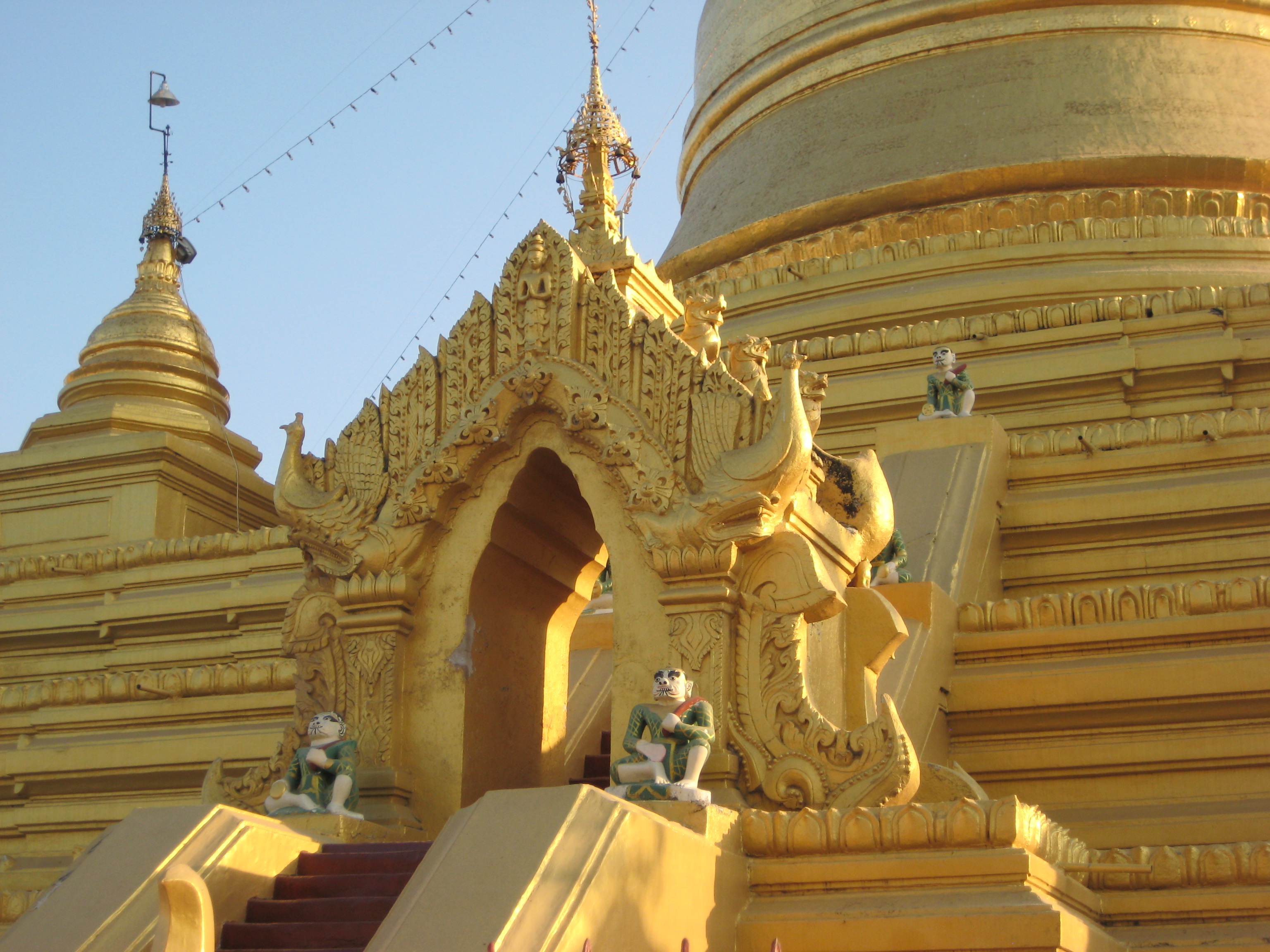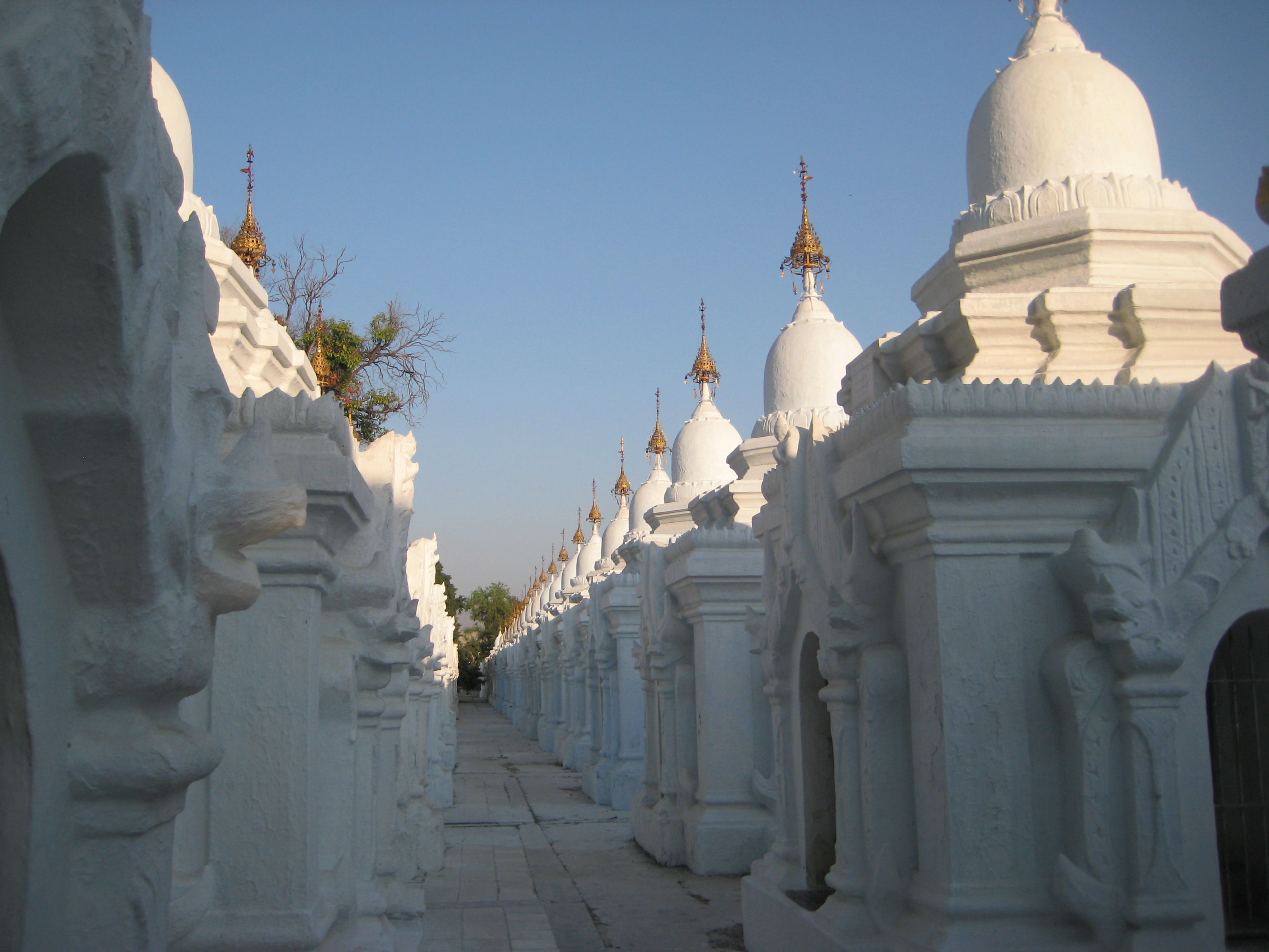 Second stop on the way from the palace to the top of Mandalay Hill – Kuthodaw Stupa, home to the world’s largest book. In the grounds of the stupa are 729 white stone gazebos, each containing a marble slab inscribed on both sides with a page of text from the Buddhist scriptures. I think I will stick to my paperback for ease of transport. It was a lovely site to look around, reminding me of small soft meringue tops on top of a cake.