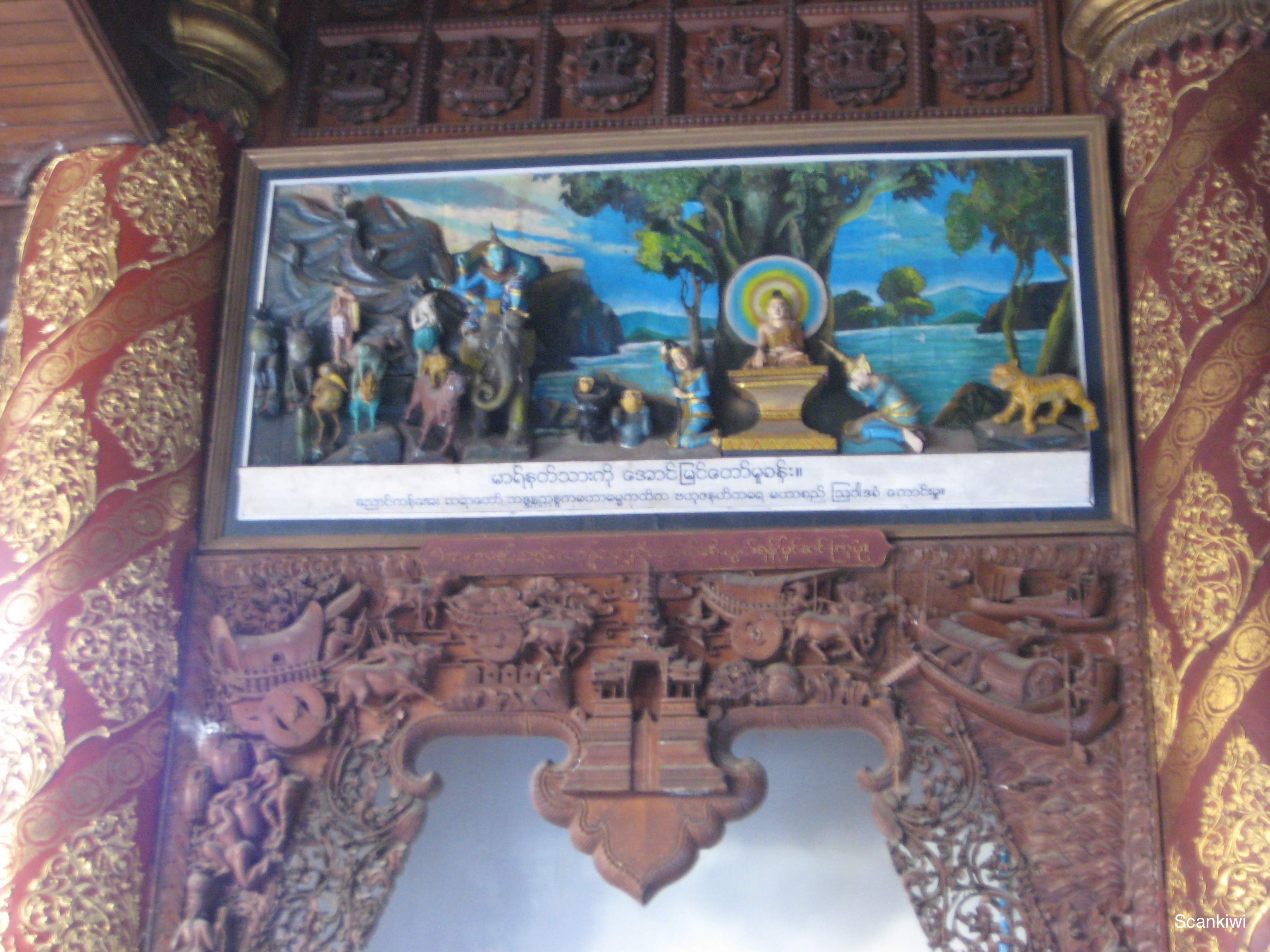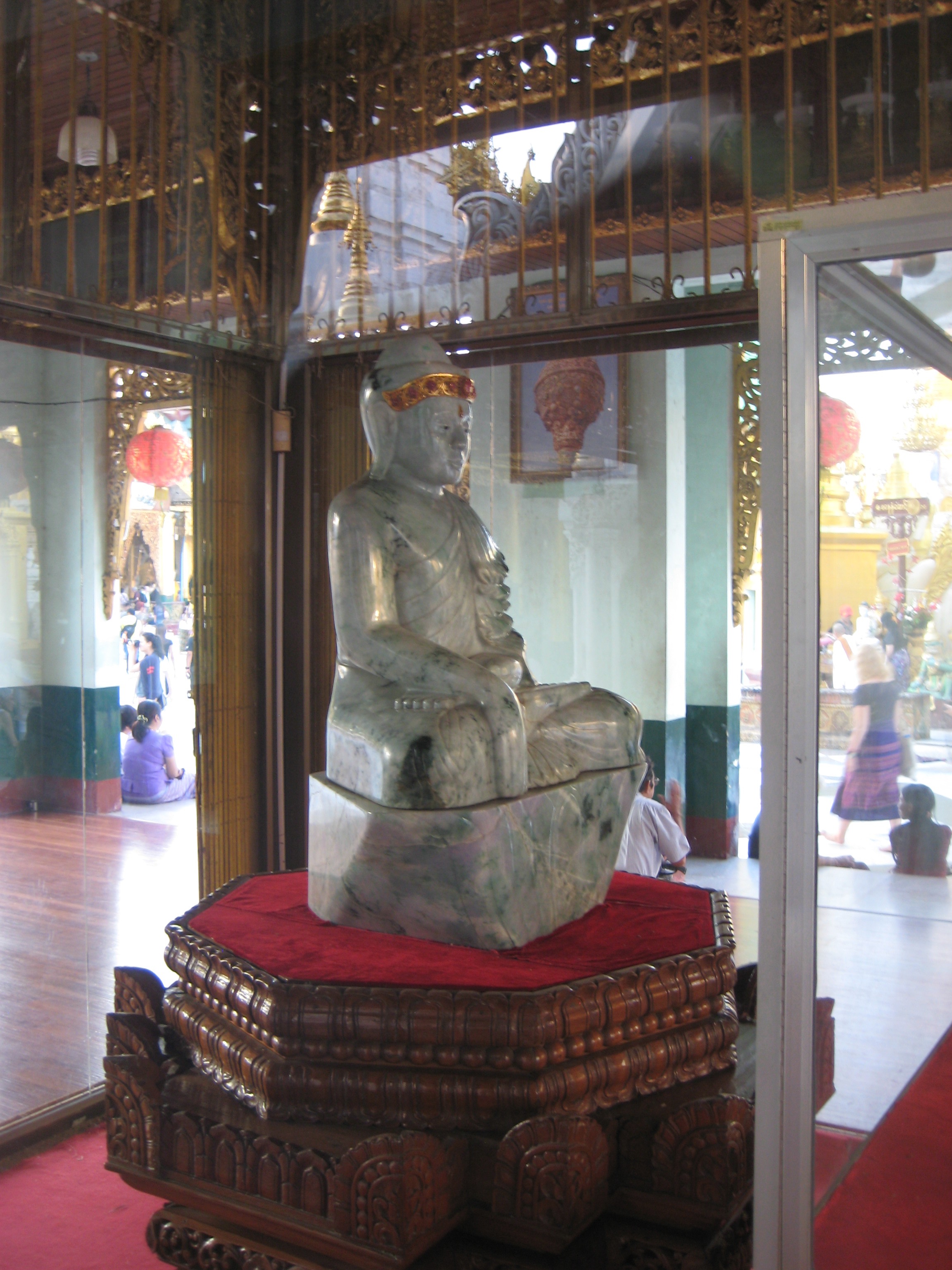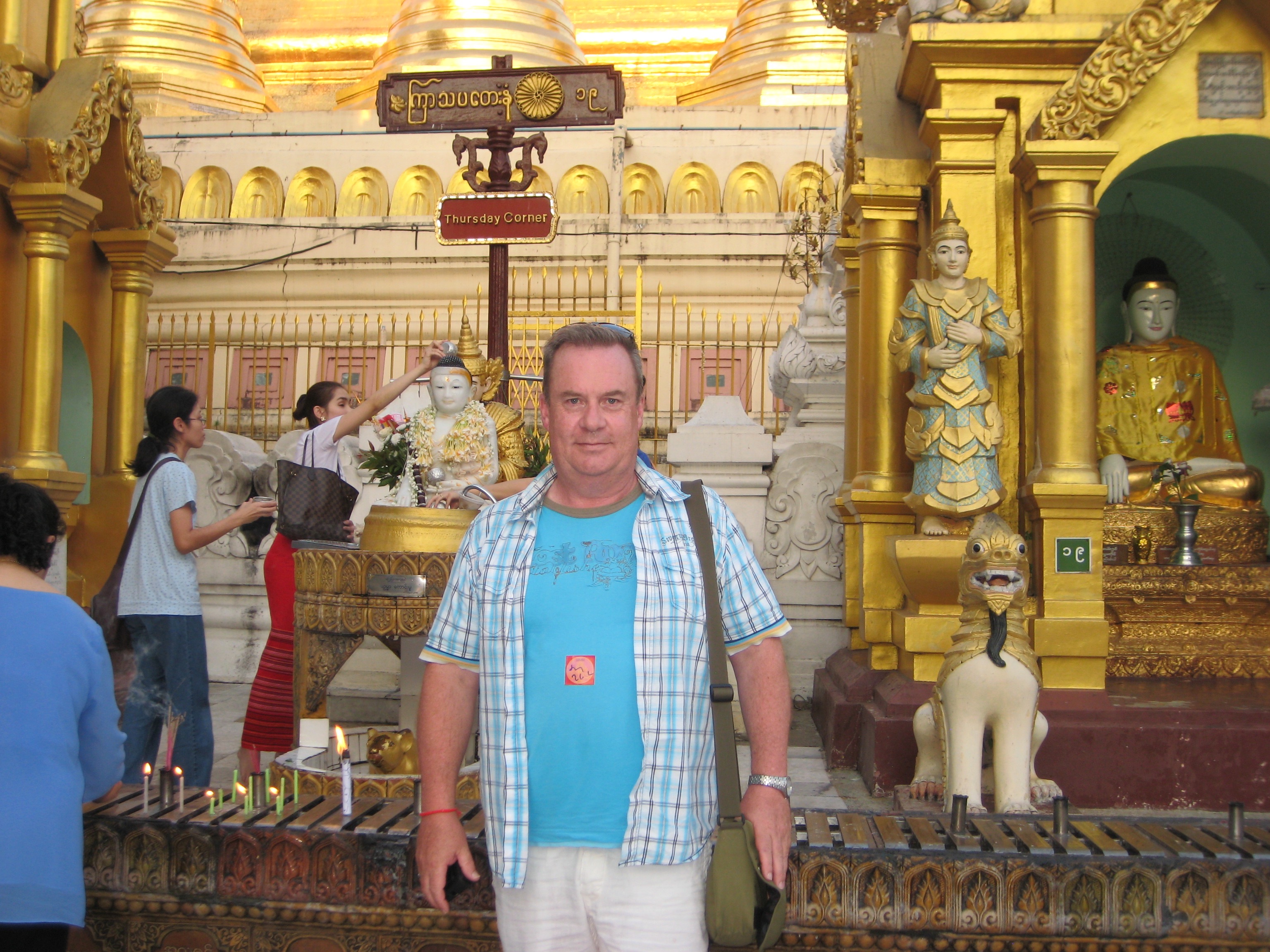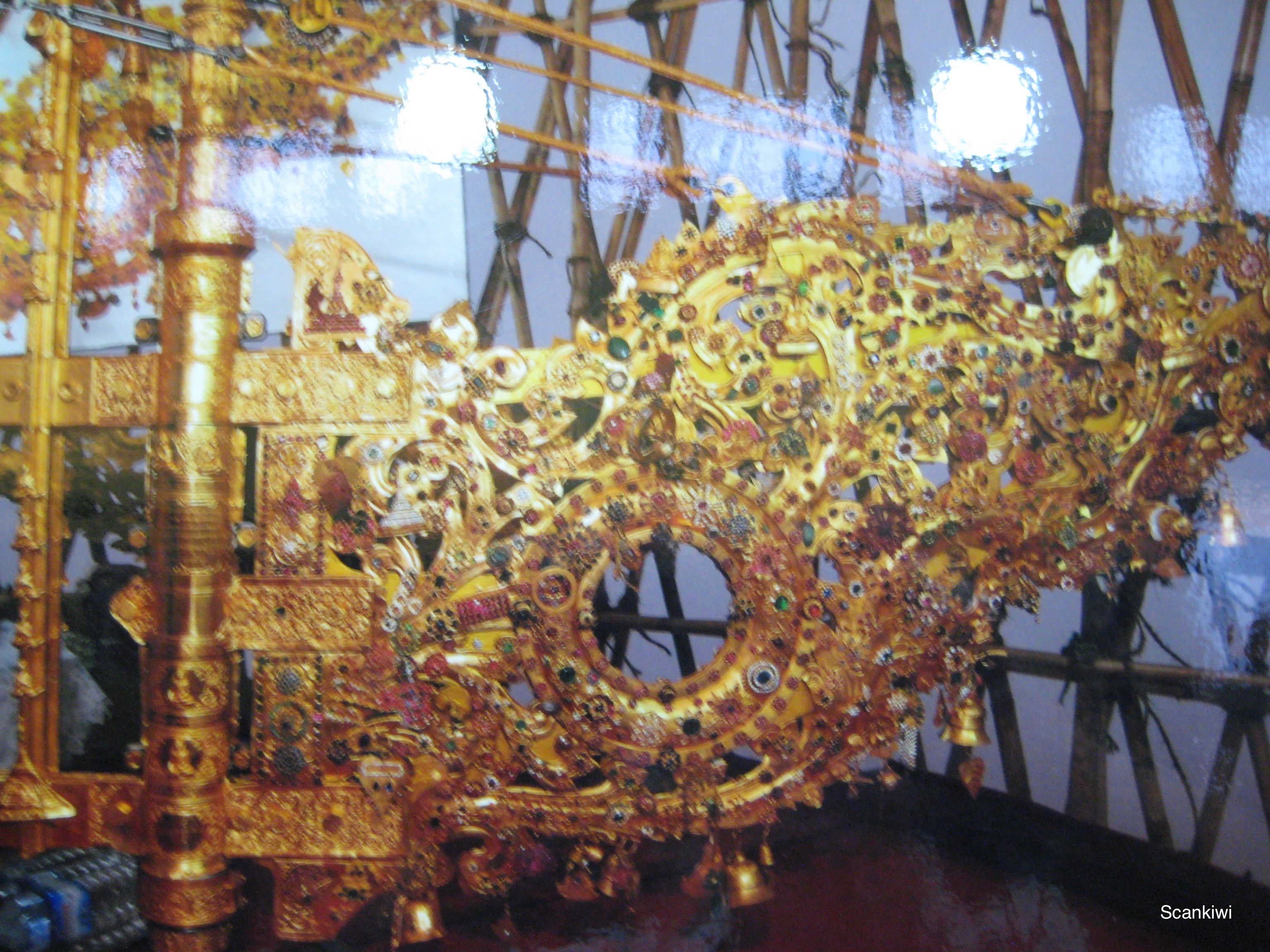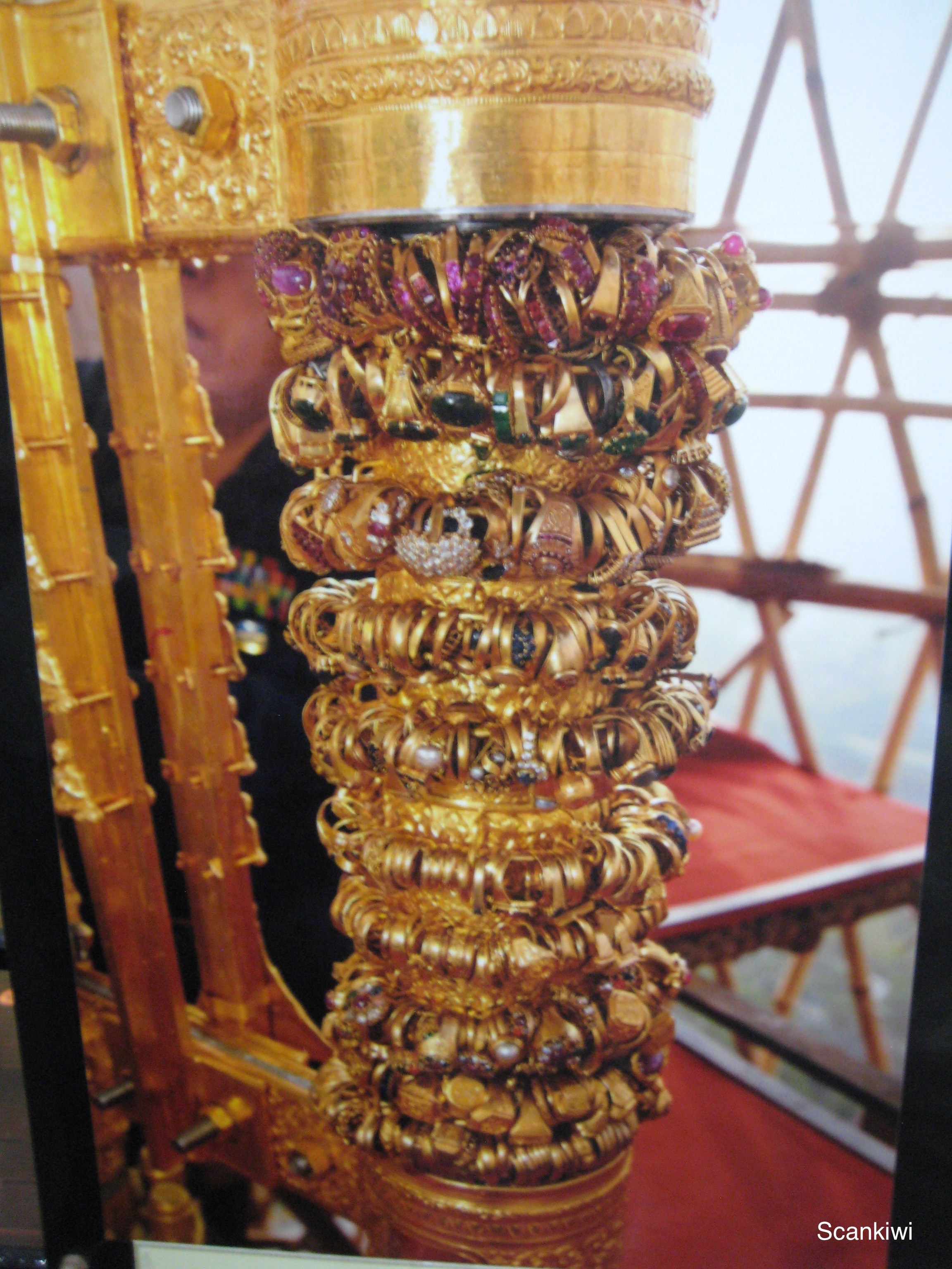 My guide took me on a walk from the Kandawgyi Lake at its foot, up the hillside to the summit to give me the full effect of the site as we approached. We arrived in the light of day as the sun was beginning to set and stayed until the night had engulfed it in order to get the full affect of its magnificence. While wandering the enormous platform of the pagoda and admiring its architecture and displays I found once again the corner celebrating the day of my birth although this time I skipped the ritual of pouring 51 cups of water over the rat Buddha. I also found the Bodhi tree which is the type of tree the Buddha sat under when he found enlightenment, however it didn’t help me a whole lot. In one hall, was a mock up of the spire that crowns the stupa and its celebrated jewels, even the mockup was impressive. As the sun was setting, my guide moved me from point to point where you could stand and see the sun glistening through the diamond atop the spire, then an emerald, then a ruby and then a sapphire. Impressive considering you are standing a 100 metres below the spire and thus showing that these stone must be of a whopping size. As the sun finally disappeared and the spotlights began to illuminated the dome, the pagoda came to life even more.
