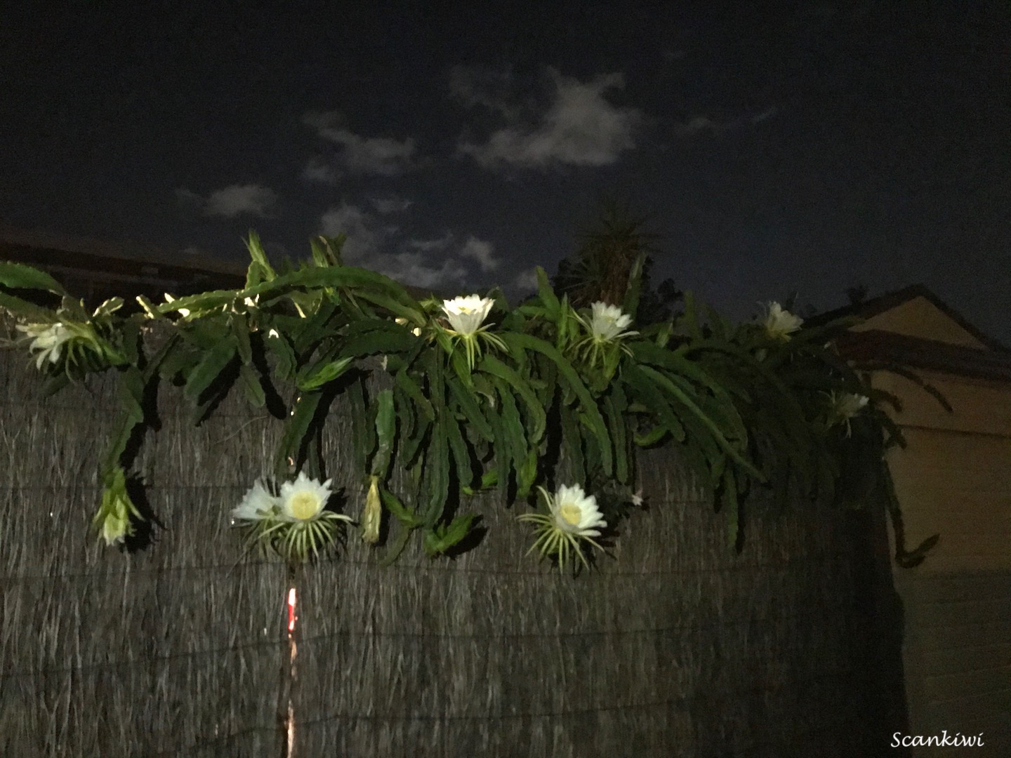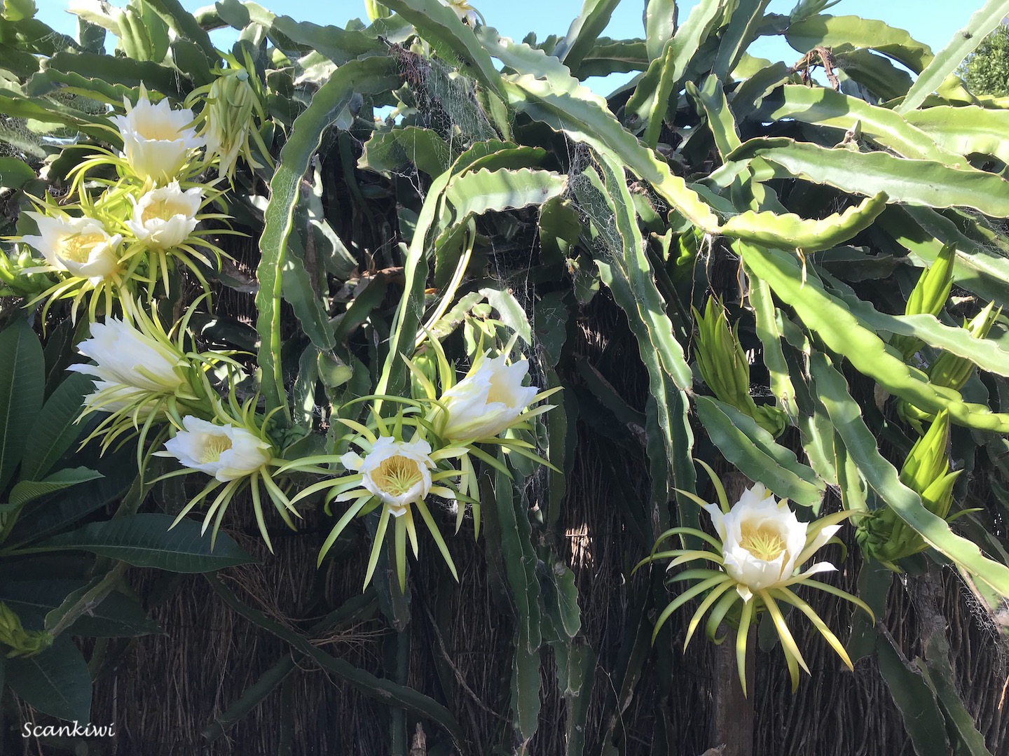 On my last evening I got to experience a spectacular event in Mike & Gustav’s garden. A nocturnal display of the succulent – Queen of the Night – flowering (also known as the Moonflower – Selenicereus). It is one of the most mysterious flowers in nature. The flower blooms once a year in the dark and usually lasts only one night before wilting. Two weeks later, the fruit appears, known to us as Dragon fruit. The succulent had draped itself along the back fence of the garden giving a spectacular display. And in the shadow of the succulent was the beautiful and fragrant Frangipani aka temple flower. I love the spectacular colour and variety of tropical plants. What a spectacular way to end my visit to Sydney. Next stop Brisbane.