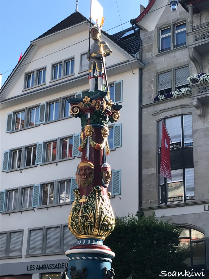 Fritschi statue on the fountain at Kapellplatz, Lucerne, Switzerland